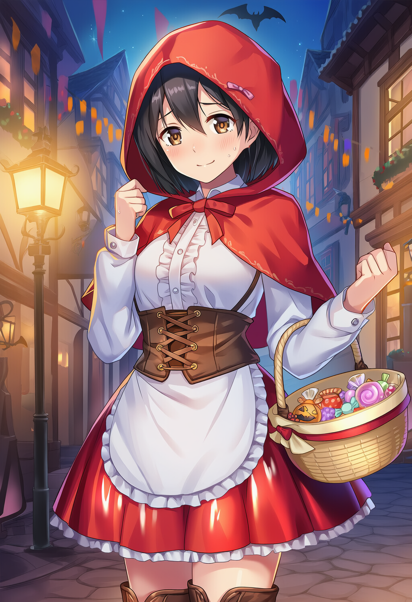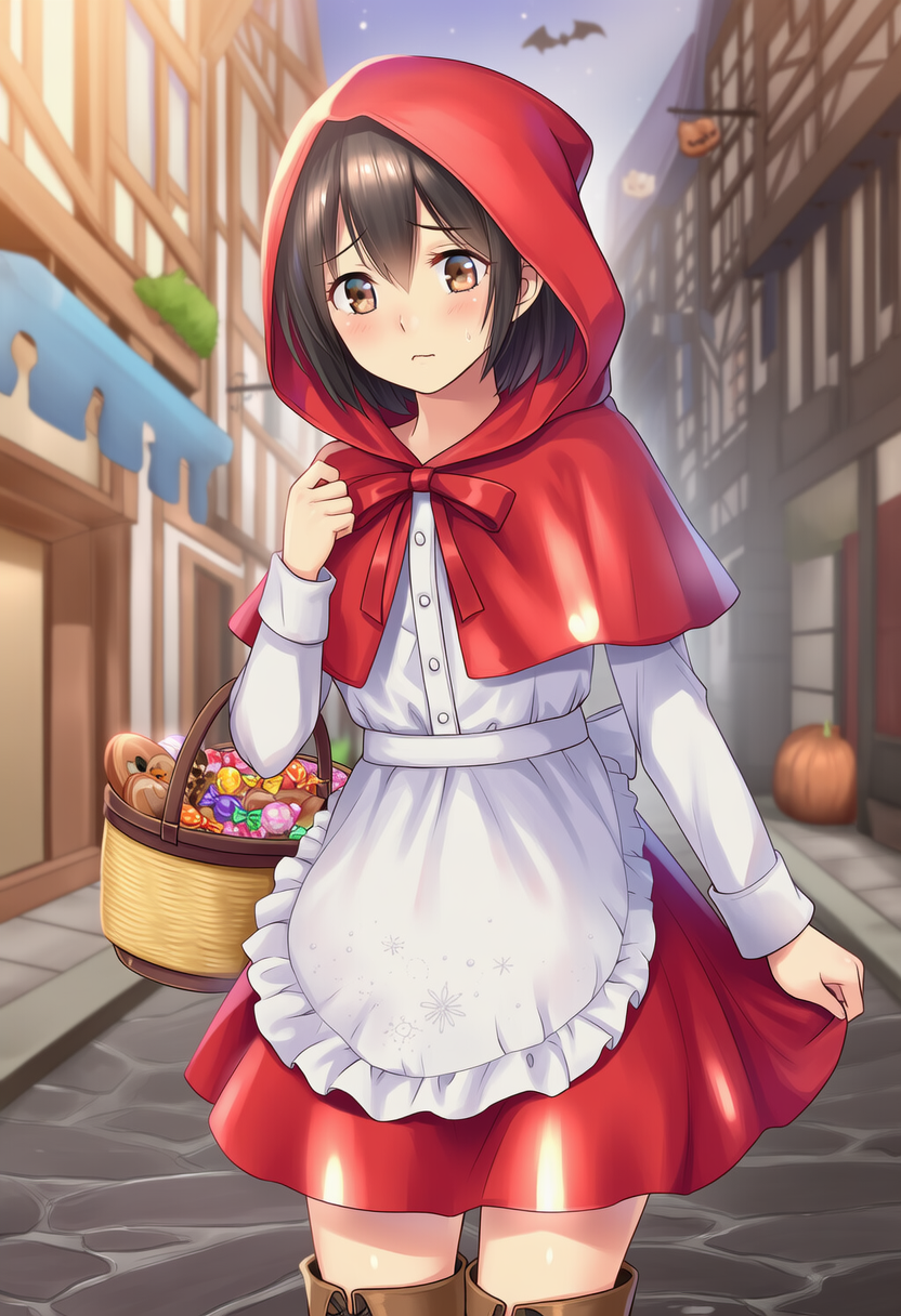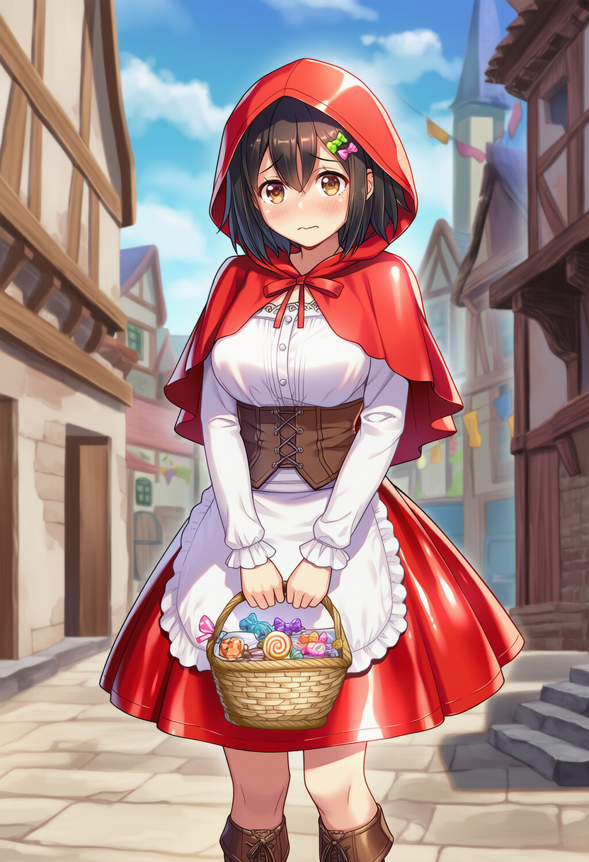 派手な衣装は、あたしには似合わない…ということで、今回は赤ずきんの女の子風のコスチュームで決めてもらいました。こっちはいかがでしょうか?
