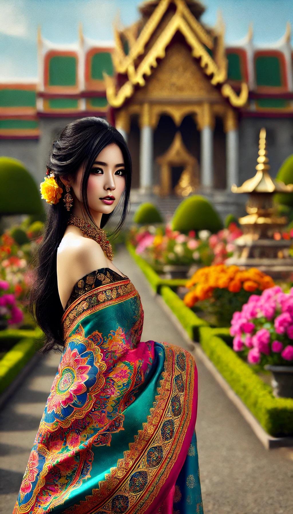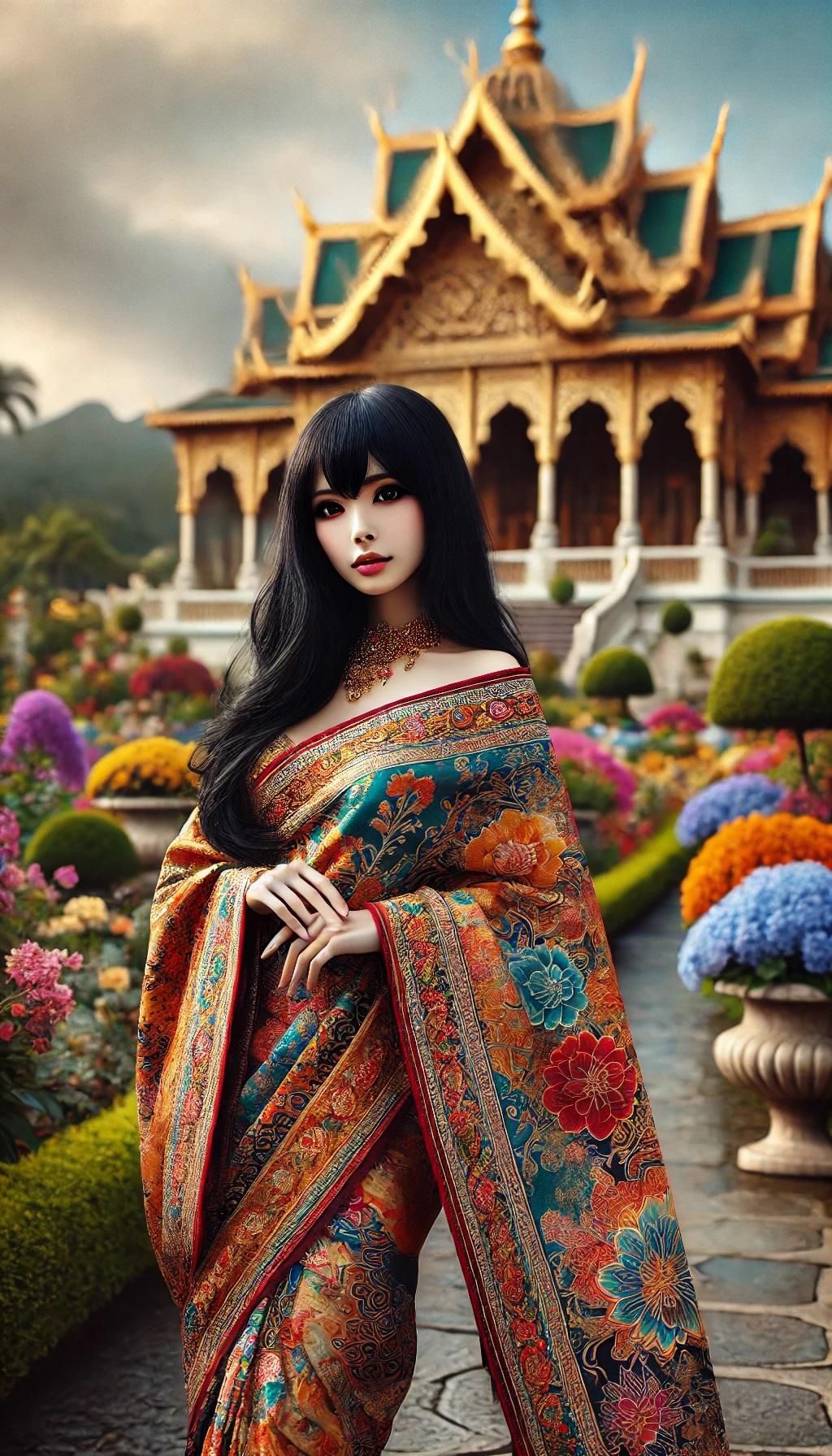 - 説明: 黒髪の艶やかさがサリーの鮮やかな色と美しいコントラストを作り出します。優美なドレープが女性らしい曲線を引き立て、黒い目がサリーの色彩に反射して印象的な表情を作ります。ゴールドのアクセサリーが加わり、グラマラスな美しさが際立ちます。