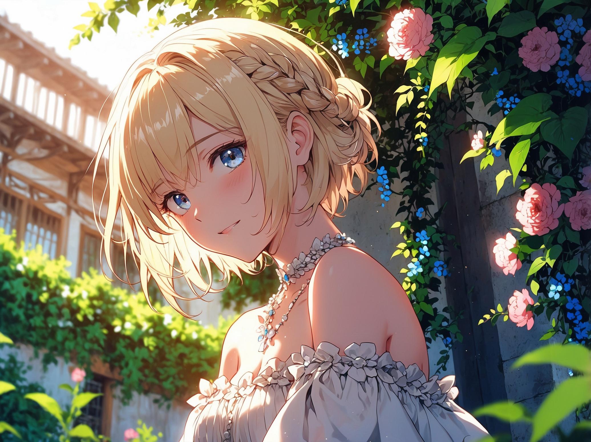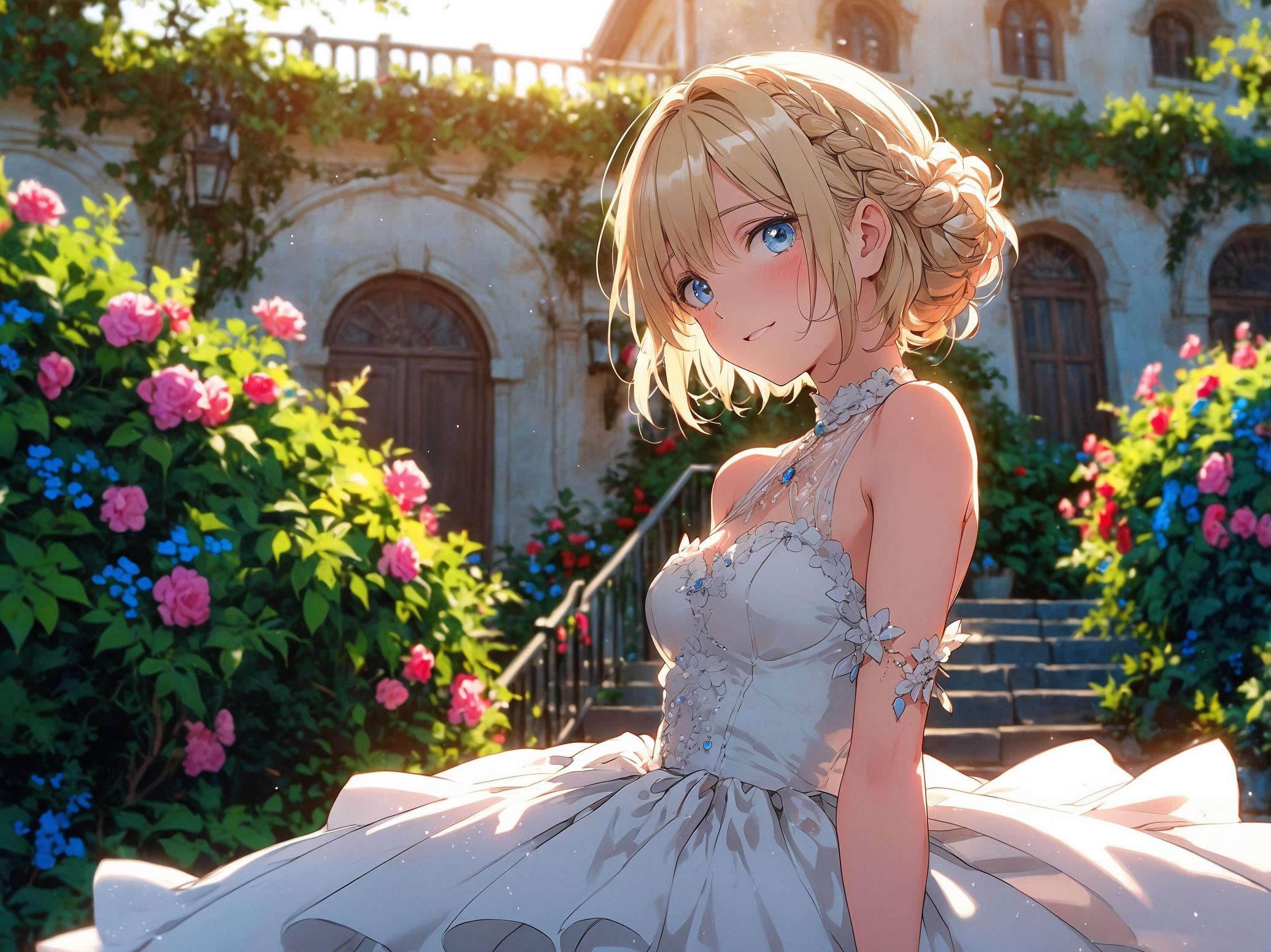 庭園を彩る花々が、少女の笑顔を誘う。