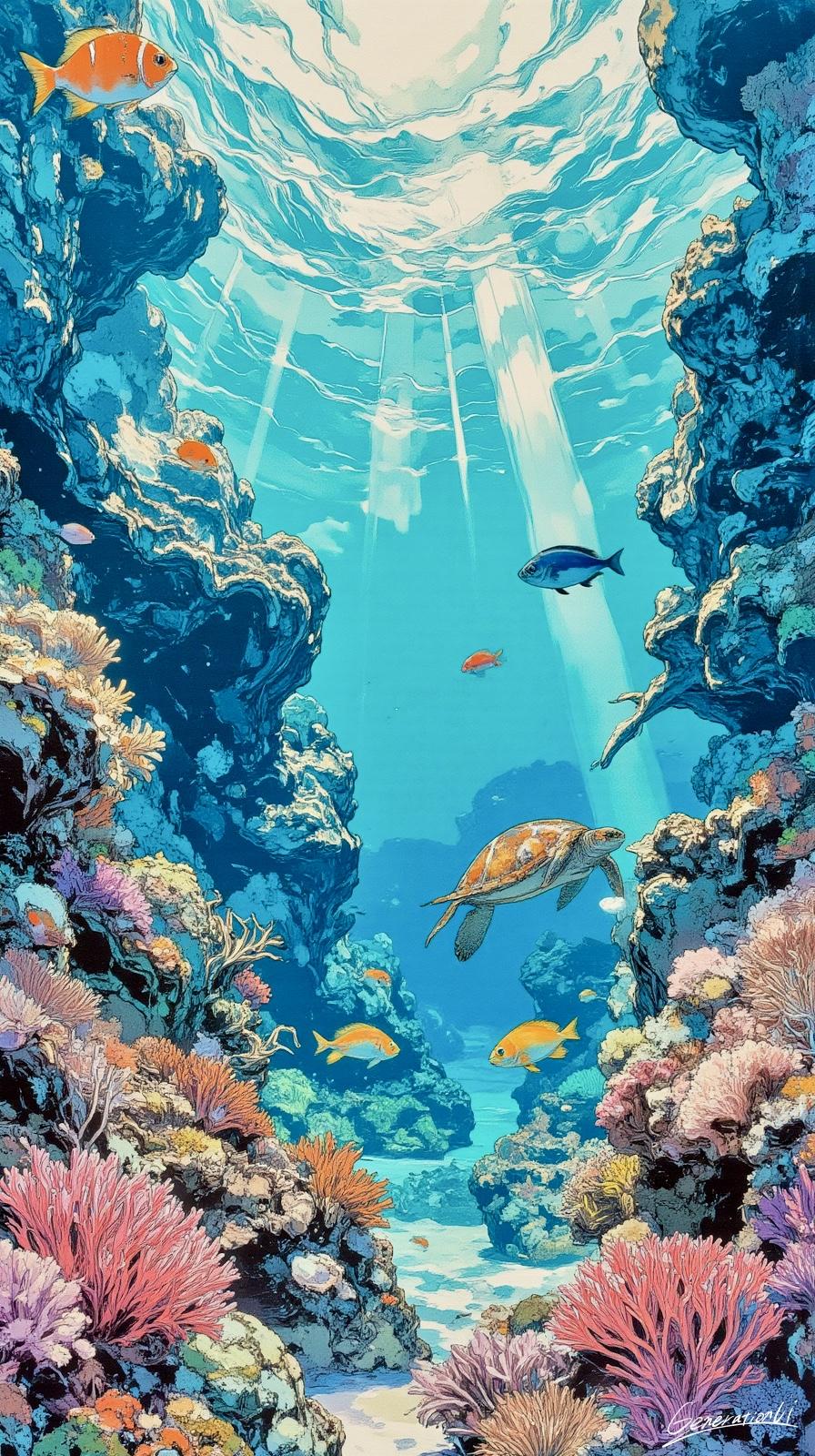 その合間を悠然と横切る海亀は、時間のルールを忘れた旅人。