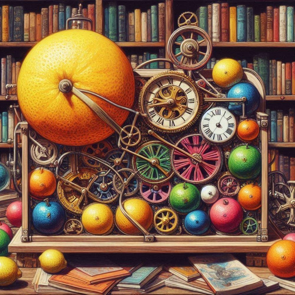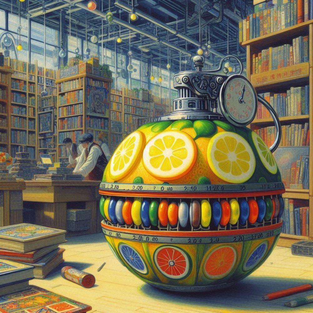 油絵大正時代日本、洋書店書棚の前に置かれた時計仕掛けのレモンの爆弾
