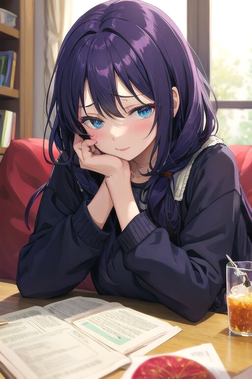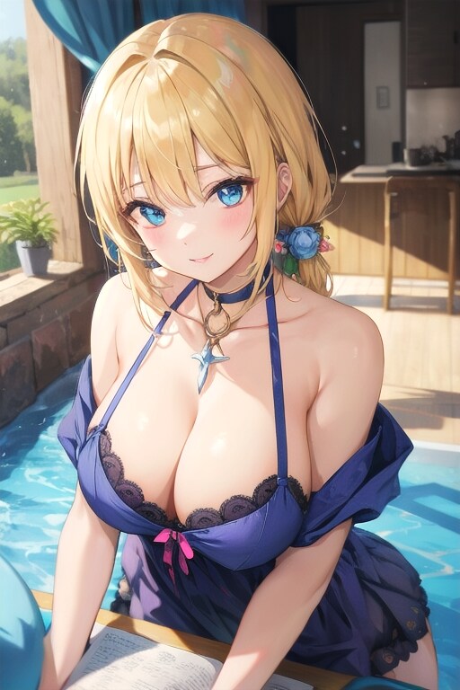 aka, ao, accessory, neck, Y型の服, yellow, smile, sitting, stomach?, shoulder, side, silver , sunshine, shadow, identity?, girl, glossy?, fence, flower, cover, colorful, cute ,curly, chair, table, temptation, thighs,