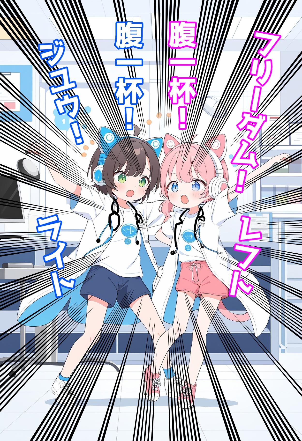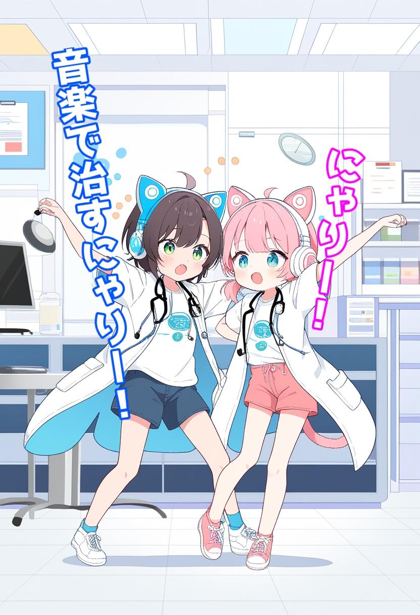 双子設定は本作のプロンプトからです。本来は一人で、音楽療法で人々を癒すという物語を書く感じで、たまごっちプチプチおみせっちの音楽で病気を治す時のマイクに向かって「お大事に♪」というのが今でも脳裏に浮かぶほど好きなもので、しかも、おみせっちシリーズの新作も出るのだと知り、制作した次第です。たまごっち最高ですね♪