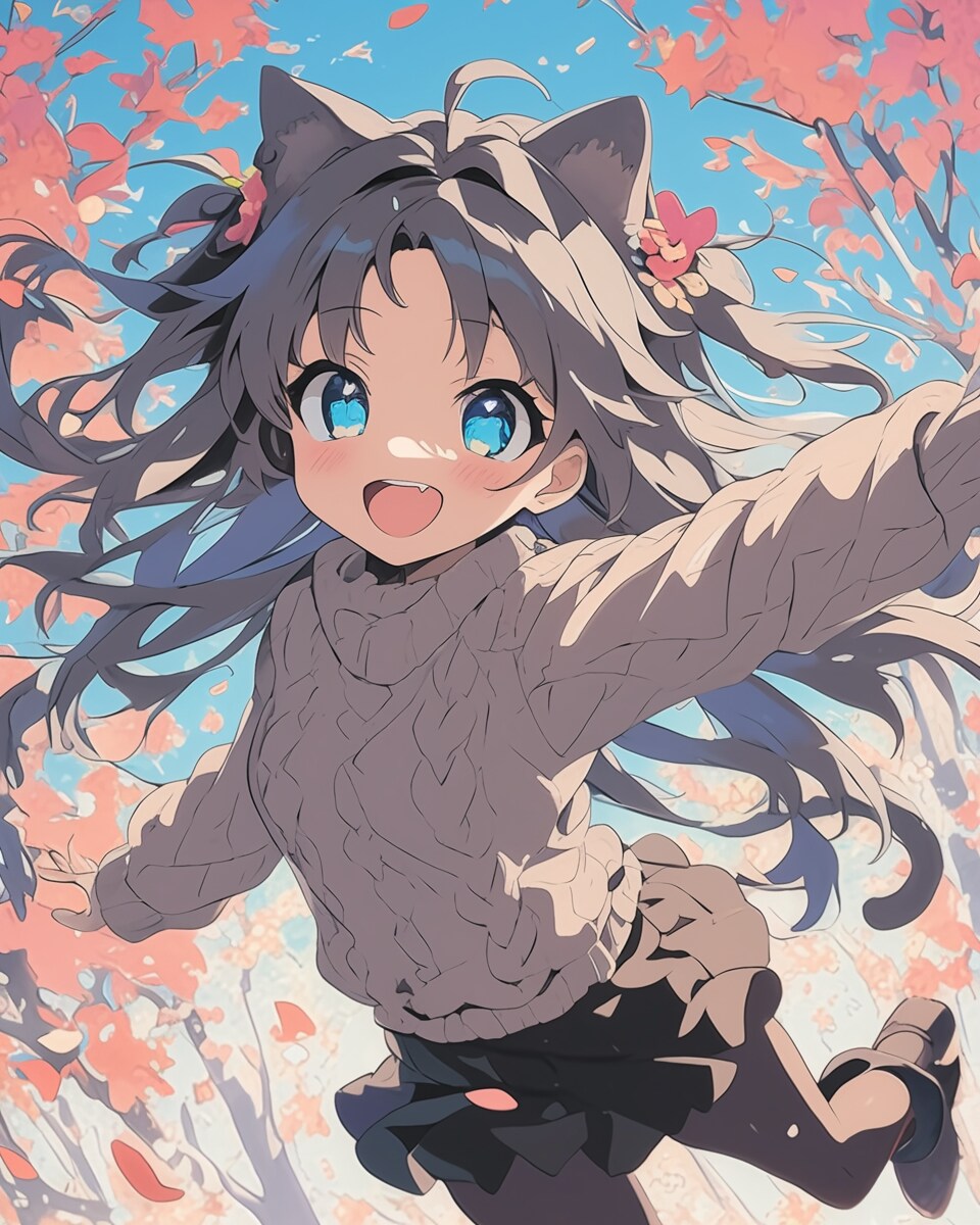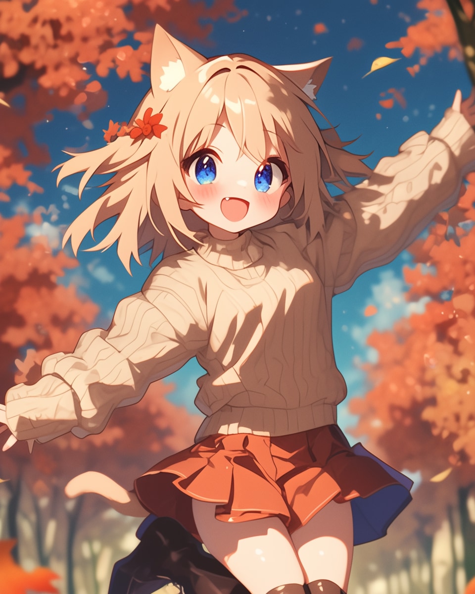 猫耳の少女が秋の柔らかな日差しに包まれ、ふわふわのセーターを身にまとって森の中を跳ねるように歩く。紅葉が舞い落ち、彼女の頬に触れるたび、彼女の笑顔はさらに輝きを増す。
