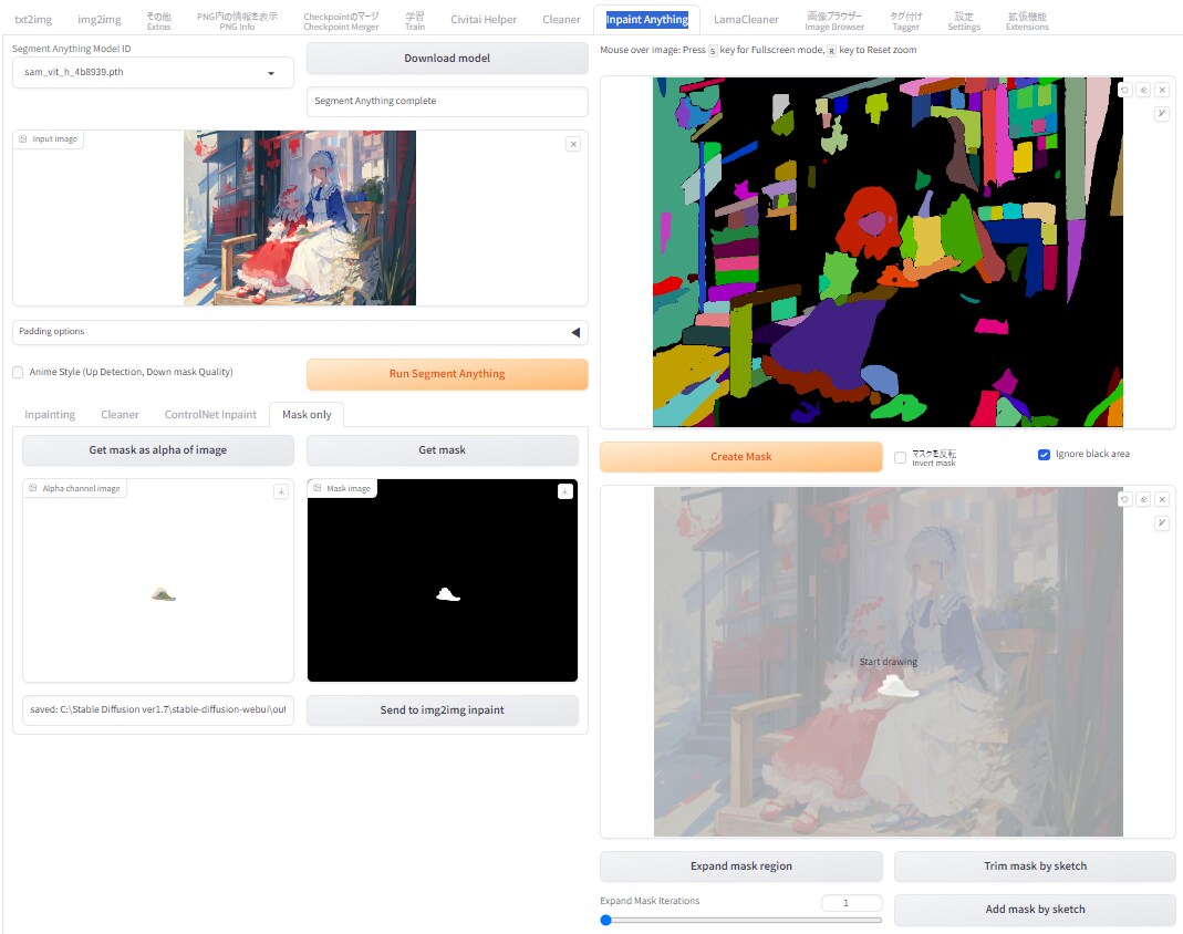 このまんま選んだマスクでInpaint AnythingでinPaint変換する事もできるのですが、