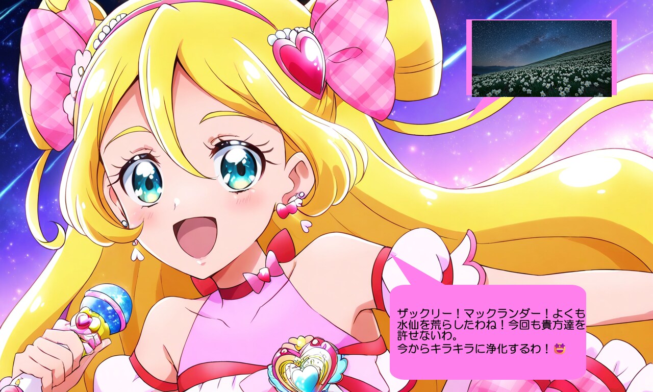 キュアアイドル:ザックリー!マックランダー!よくも水仙を荒らしたわね!今回も貴方達を許せないわ。今からキラキラに浄化するわ!🤩