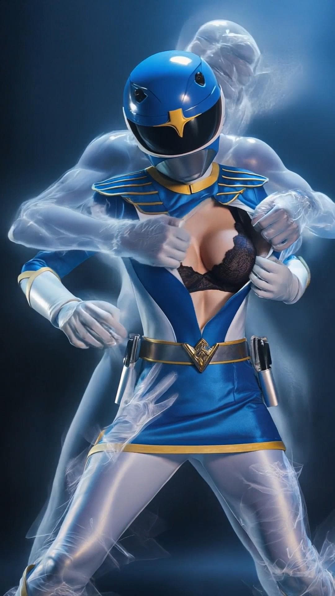 異空間でスーツを弄られていると、背後から実体が定まらない生命体に取りつかれる。一瞬にしてスーツが分解されると、彼女の下着が露わになり胸を揉まれる