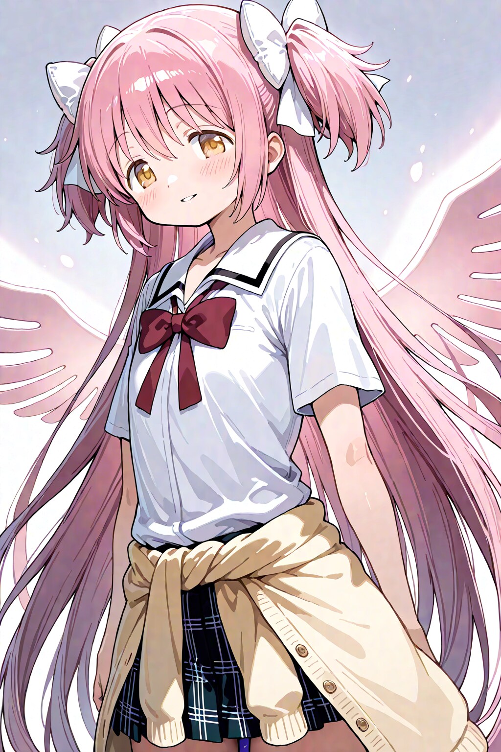 制服にカーディガンを腰結び(腰に巻いた)したアルティメットまどか。