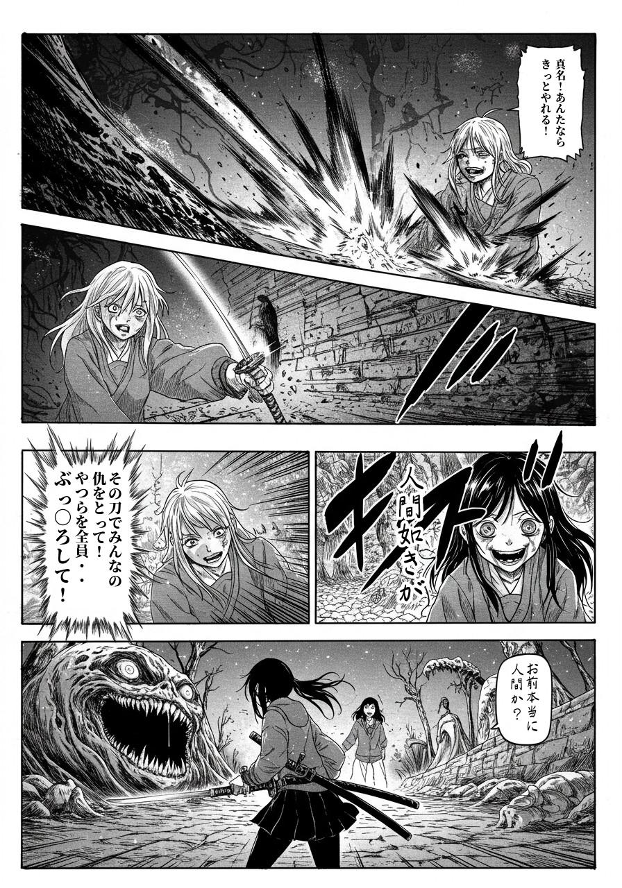 「この刀を受け取れ!名も知らぬ女子よ!かつて魔物に敗れた我ら八人の無念の魂と奴らを〇ろせる妖刀を受け取るのだ!!」「敗れたと言っても、多勢に無勢なうえ、奴らの策略にハマり孤立させられたからだ!!単体でも十や二十の魔物に遅れは取らぬし我ら八人が揃えば、何百体相手でも敵ではないっ!!」