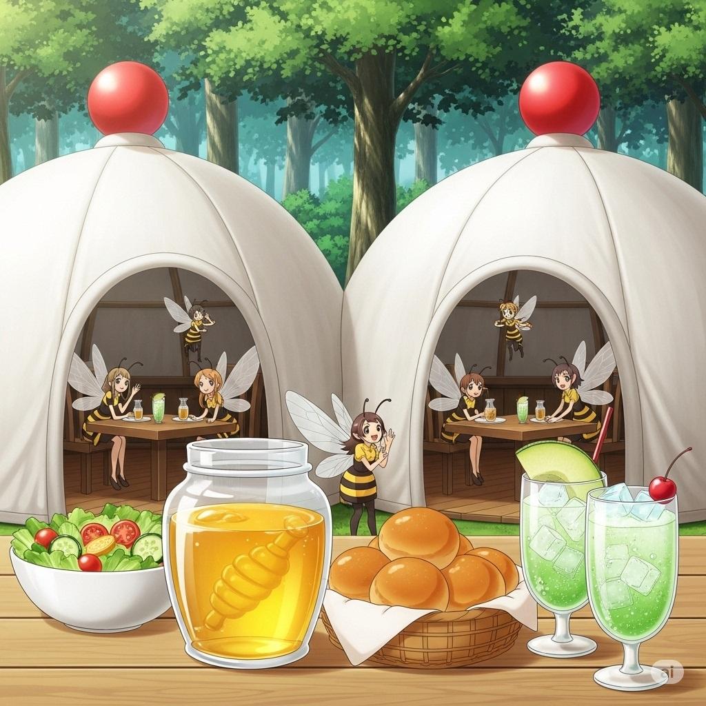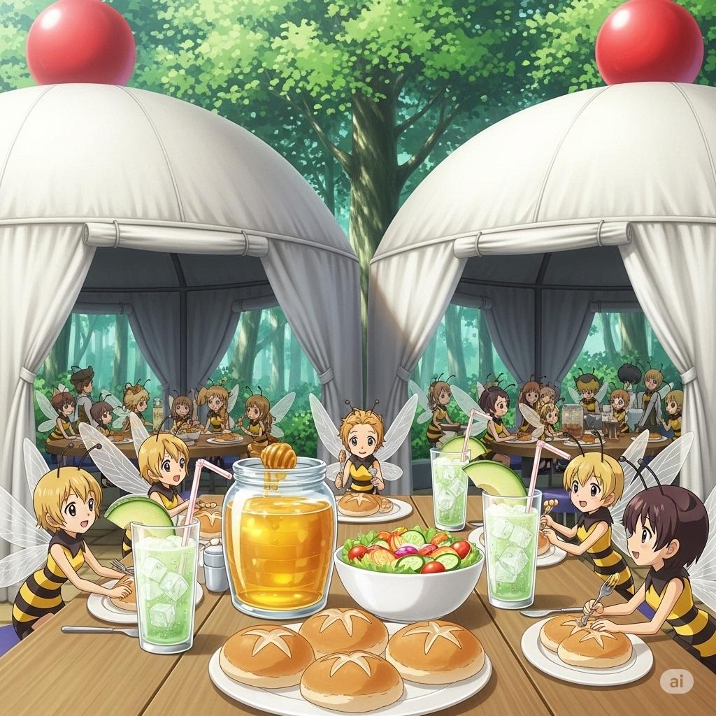 「乳テント」からイメージしました。みつばちの妖精たちが食事しています。