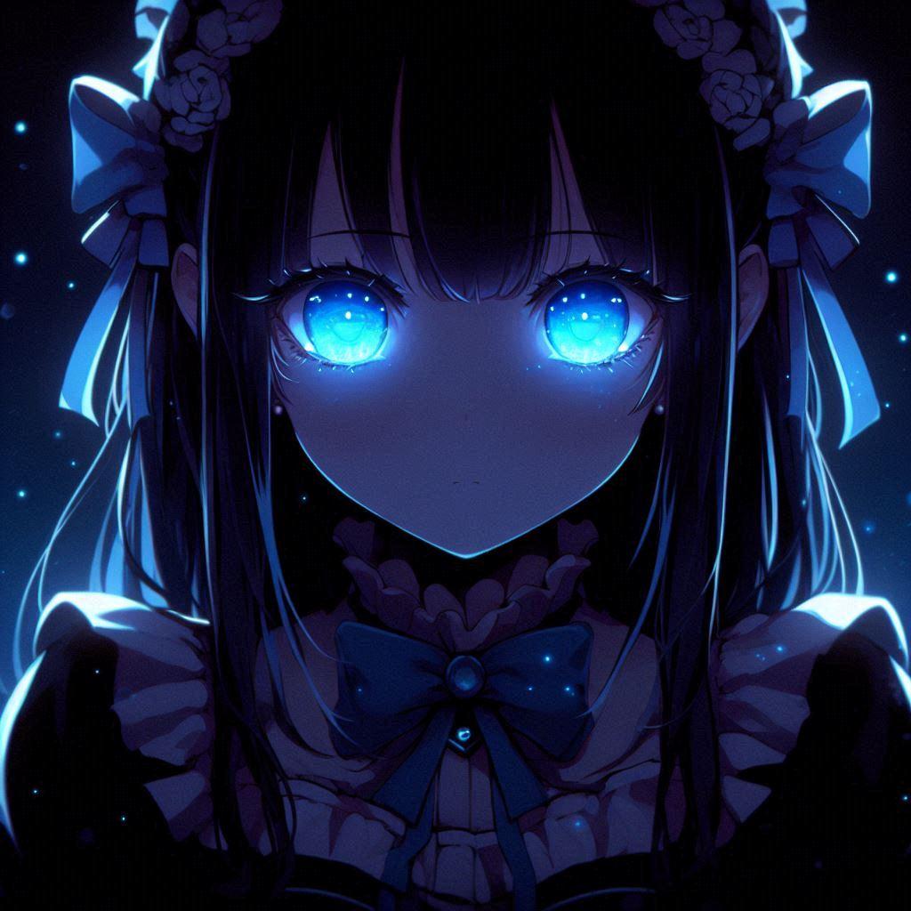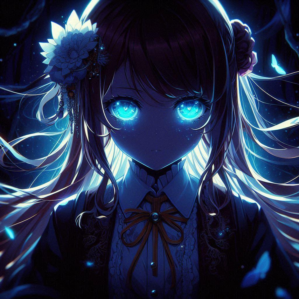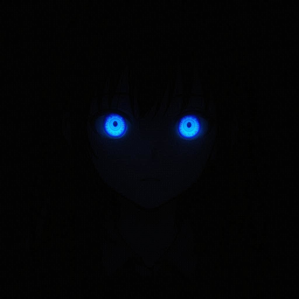 『アニメイラスト。暗闇の中で群青色に発光する女の子の瞳だけが見えている。』