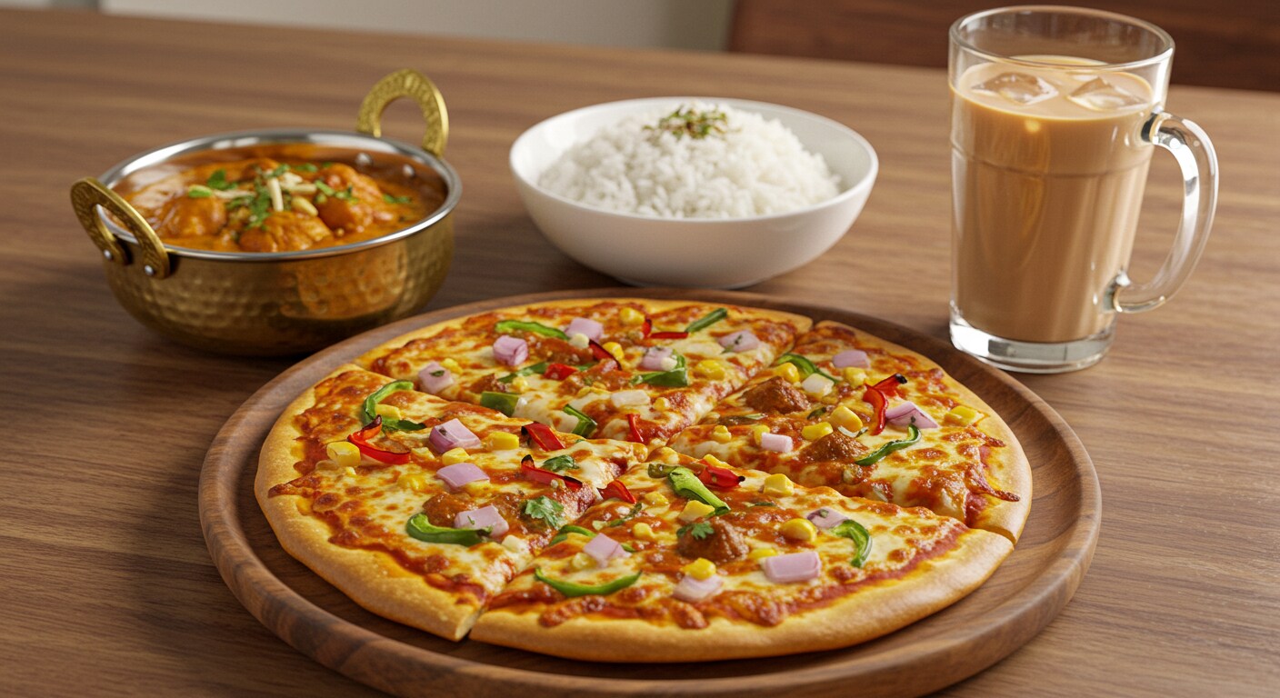 摩訶不思議食堂のスパイシーカレーとスパイシーピザと冷たいマサラチャイのセット