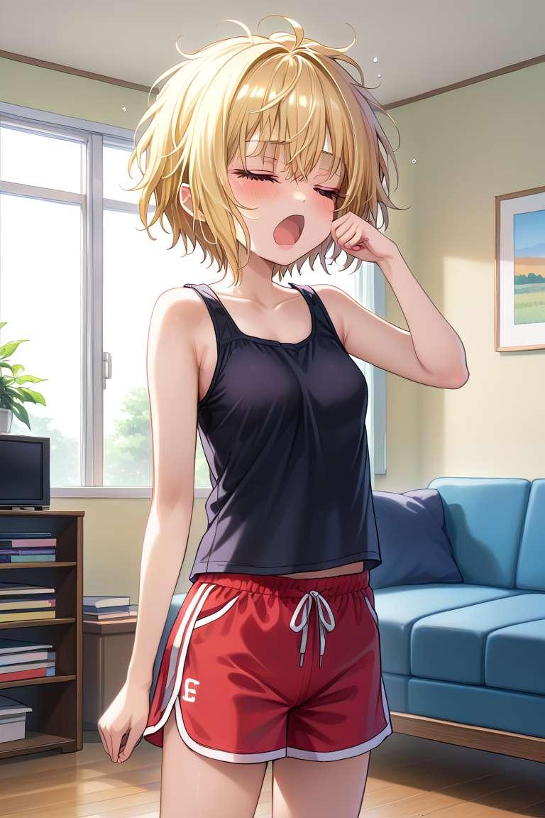 ボサボサの髪(messy hair)と欠伸(yawn)で寝起き感を出した