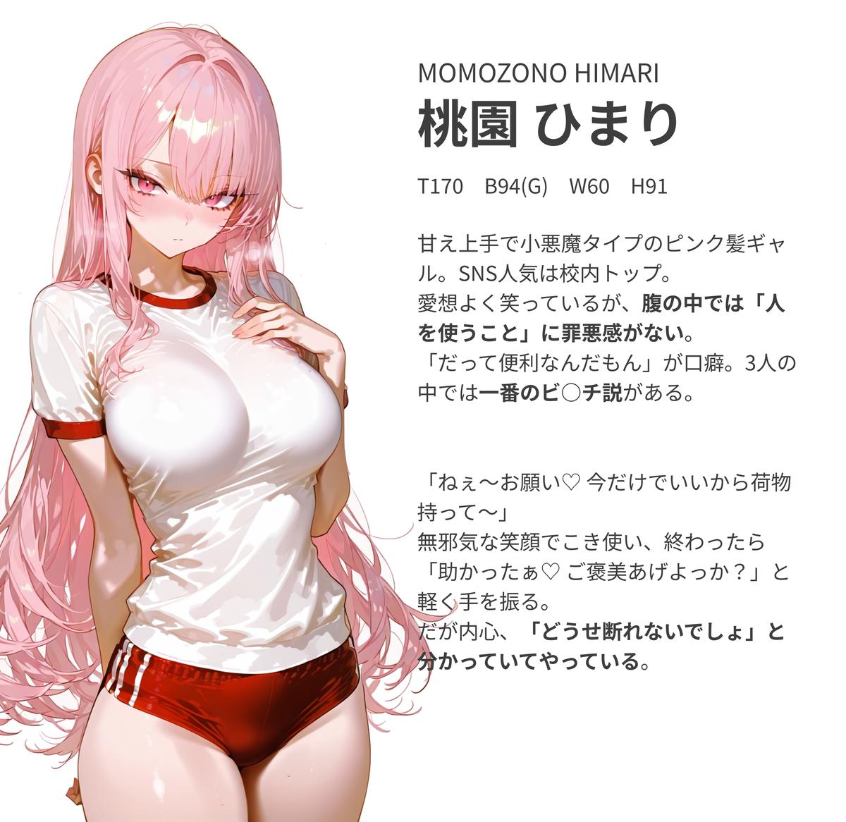 甘え上手で小悪魔タイプのピンク髪ギャル。SNS人気は校内トップ。