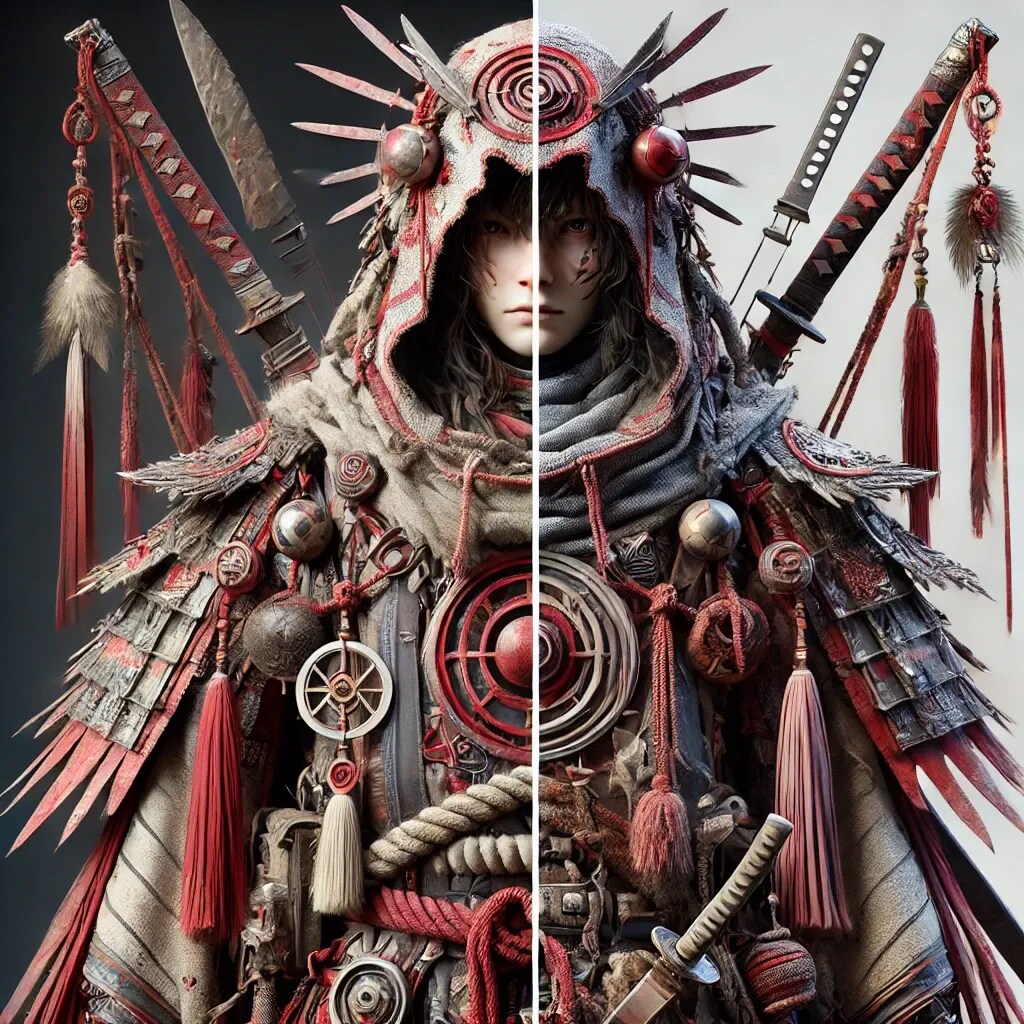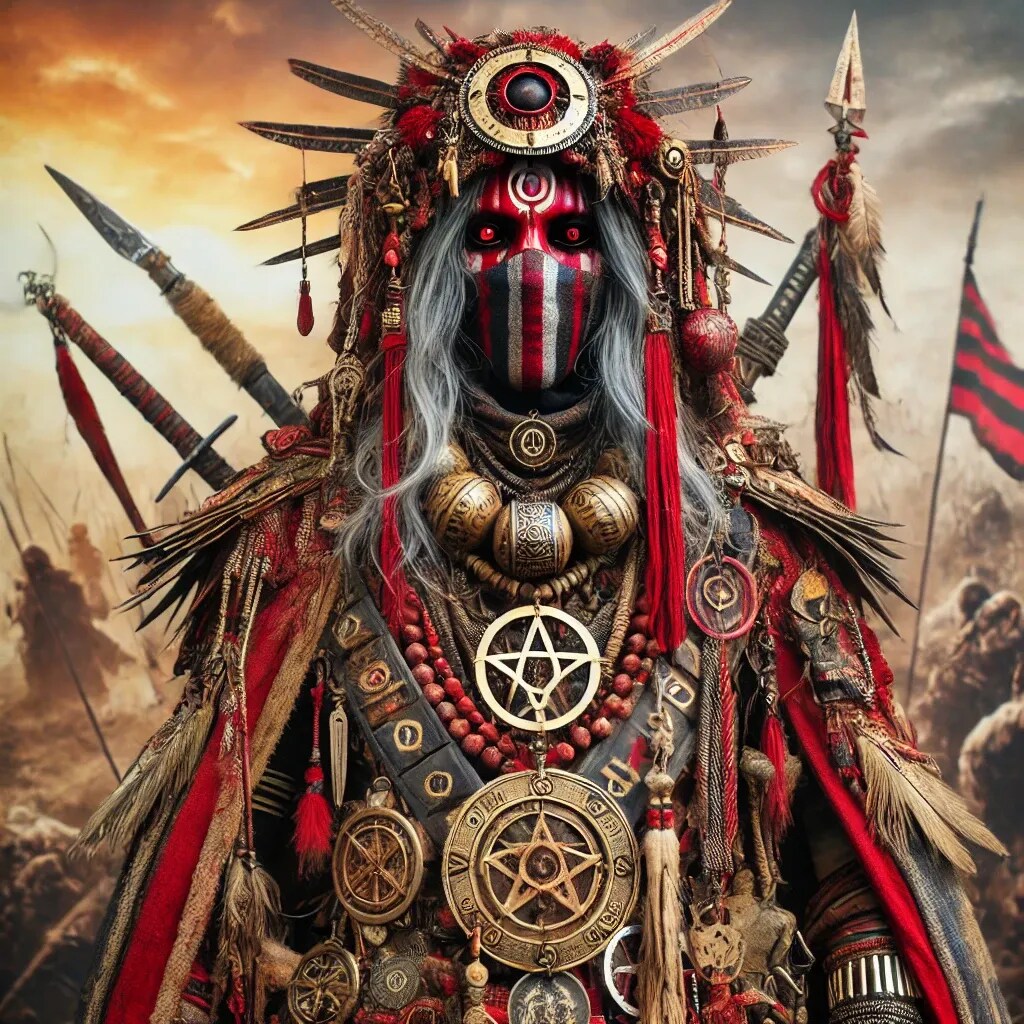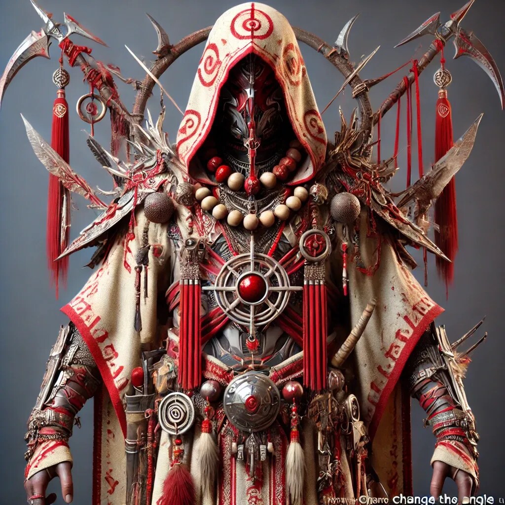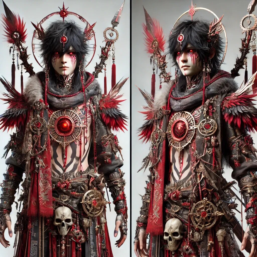外見は、霊的な儀式に使う衣装と、戦闘のための武具が組み合わさった装いをしています。彼の姿は、神秘的なシンボルや儀式具が散りばめられた服に、血のような赤い色や鋭い武器を持っているかもしれません。彼の目には、戦闘の覚悟と霊的な洞察が宿っています。