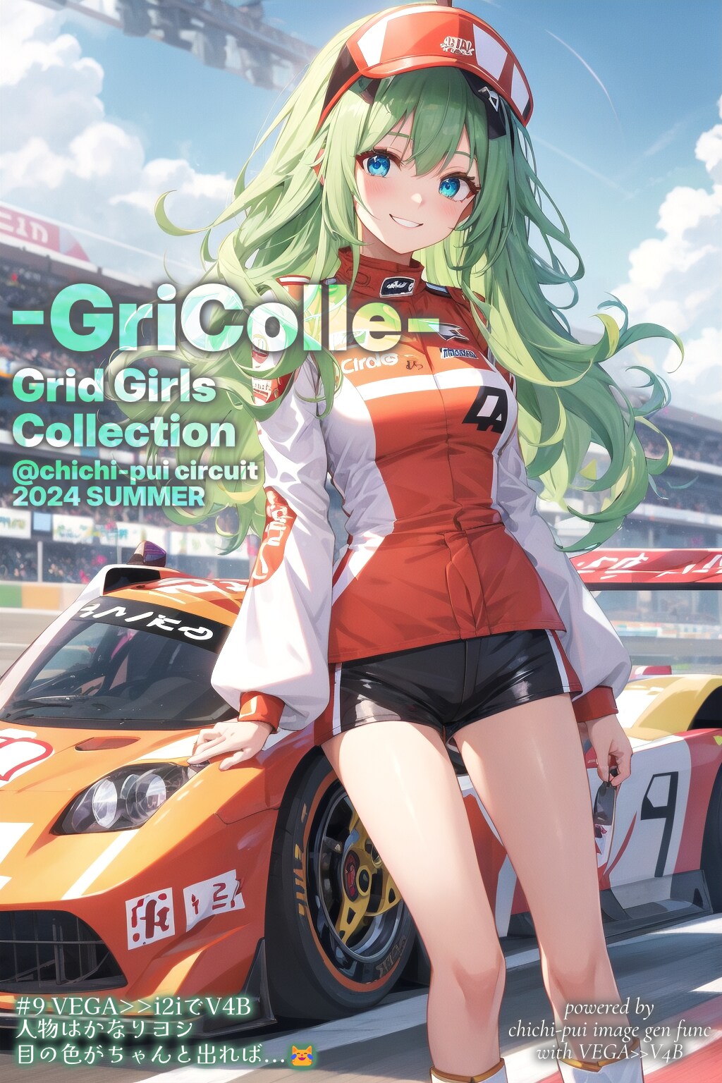 しかしうまく行かなくて、後述のVEGA版の構図が良かったので呪文の細部をちょっと変えてからi2i。ようやく赤い目になったのでこれならちち生版のジュネットですと言い張ればギリありかな...? 背景もサーキットぽい...ということで表紙のメイン作品に採用したものです。