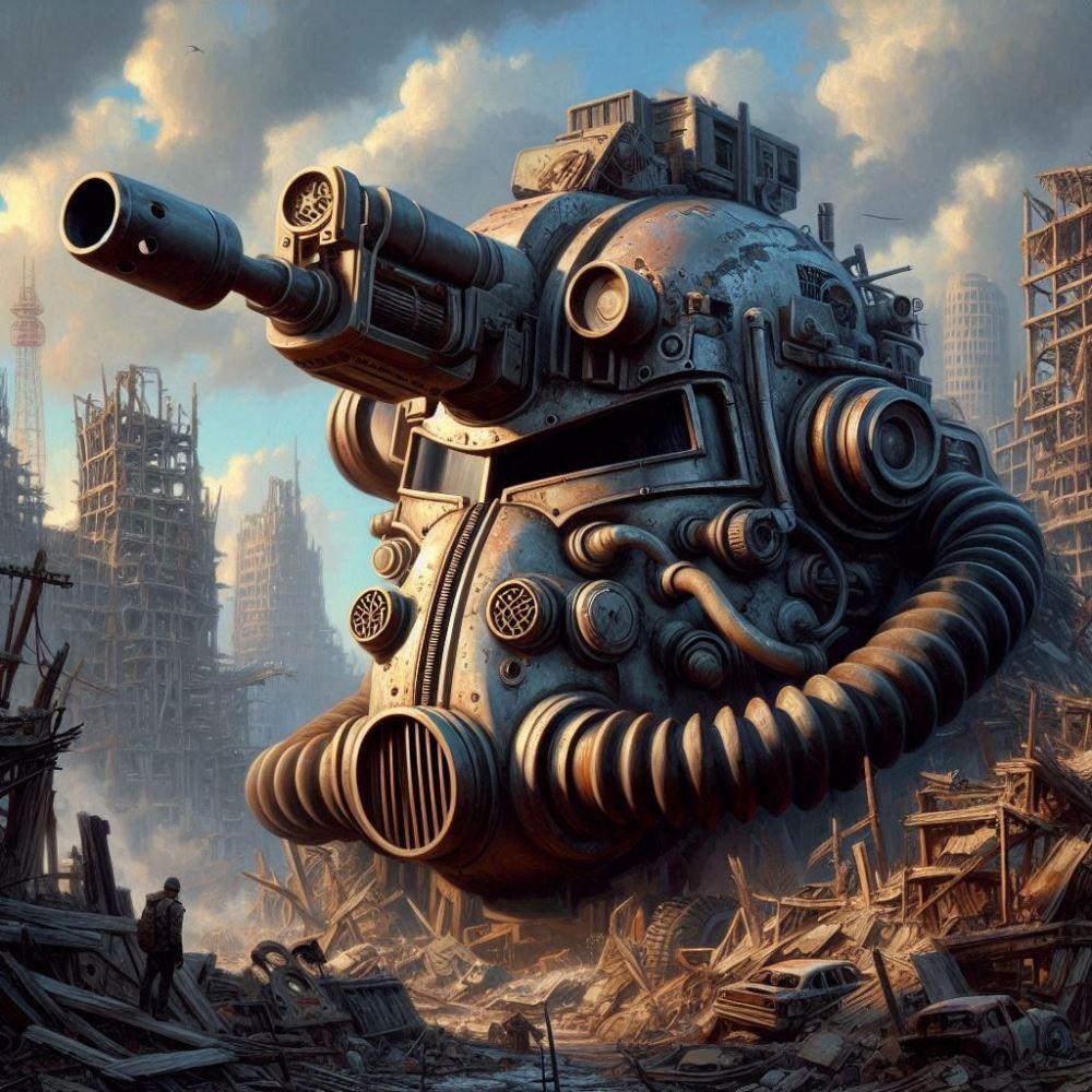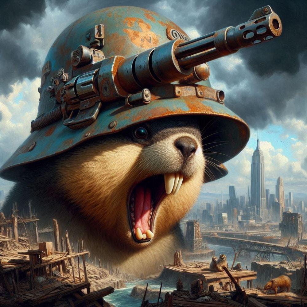 世紀末油絵風、ミニガン付き鋼鉄製帽子マーモット