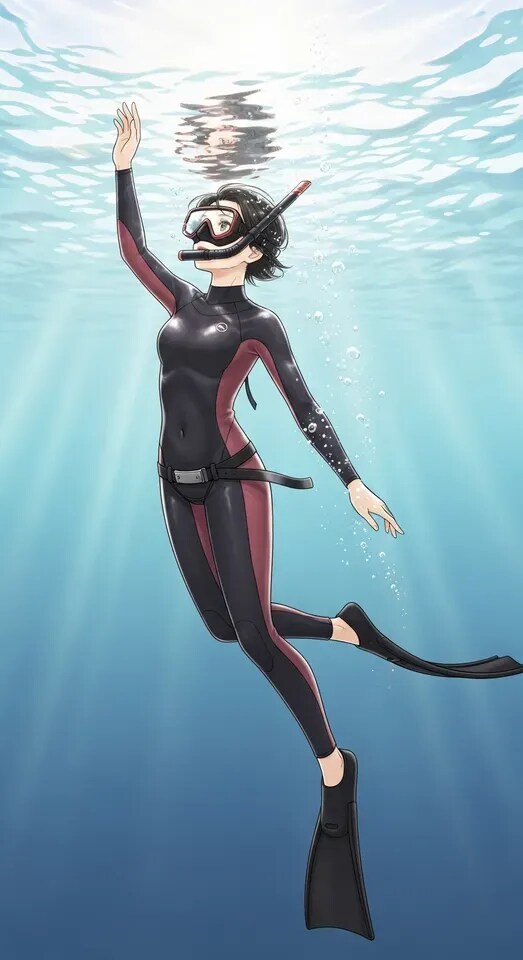 https://www.chichi-pui.com/posts/642eed85-9816-42a0-ad5c-e3a2c04fe512/ でスキンダイビングをしているダイバーを生成できたので、もしかすると浮上中のスキンダイバーも生成できるかも、と思って、プロンプトを調整して生成しました。