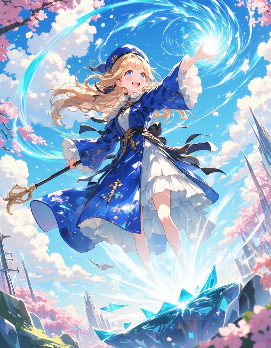 A vibrant midday adventure in a magical fantasy realm during Japan's rainy season in June, where one adorable young girl with long, flowing blond hair styled in loose waves with bangs, her sparkling blue eyes filled with excitement, a wide beaming smile with an open mouth, looks slightly upward while casting a spell with confidence and joy; wearing an elegant blue priestess robe with flowing wide sleeves, adorned with glowing golden cross patterns and star-shaped embroidery, a matching blue beret with a golden cross, white frilled trim, and a fluttering black ribbon tied at the waist, with subtle raindrop effects glistening on her robe; set against a fantastical sky with a soft drizzle falling from misty gray clouds, shimmering crystal islands reflecting the diffused light, vibrant hydrangeas blooming in shades of blue and purple, cherry blossoms drifting gently with the rain, a radiant magical aura glowing in shades of blue and gold, and a distant shimmering castle faintly visible through the misty air; using a palette of deep sapphire blue, ivory white, radiant gold, soft pastels like blush pink, mint green, and shades of blue and purple from blooming hydrangeas, creating a dreamy and ethereal tone with glowing magical effects, contrasted by the muted grays of a rainy sky; in an anime-inspired refined ligne claire style (1.4), with crisp white outlines, ultra-detailed (absurdres), vibrant and enchanting with a polished, high-quality finish, capturing the serene beauty of a rainy day; a dynamic scene capturing the young sorceress leaping forward with her staff raised, angled slightly from below to emphasize her heroism, surrounded by falling raindrops, swirling cherry blossoms, vibrant hydrangeas, and a trail of glowing blue magic, with a radiant magical aura enveloping her amidst the gentle rain.