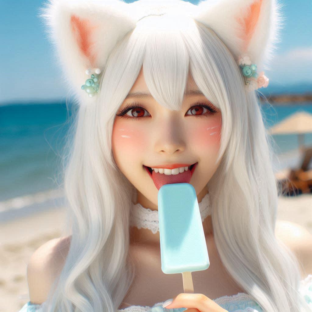 ガリガリ君を舐める雪狐。でもね、ガリガリ君って舐めるものなのか? かじりたい😅