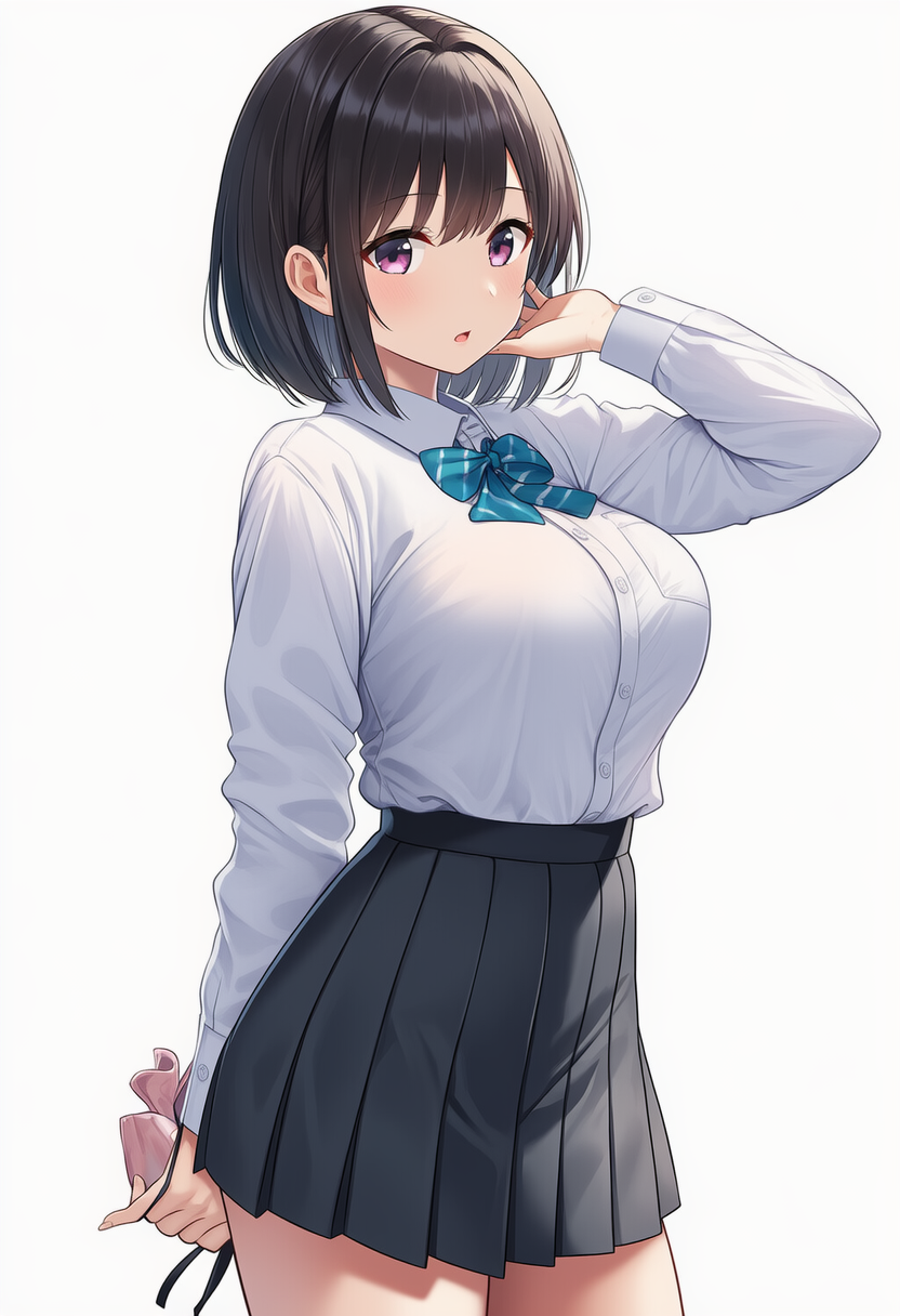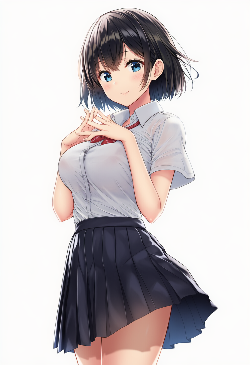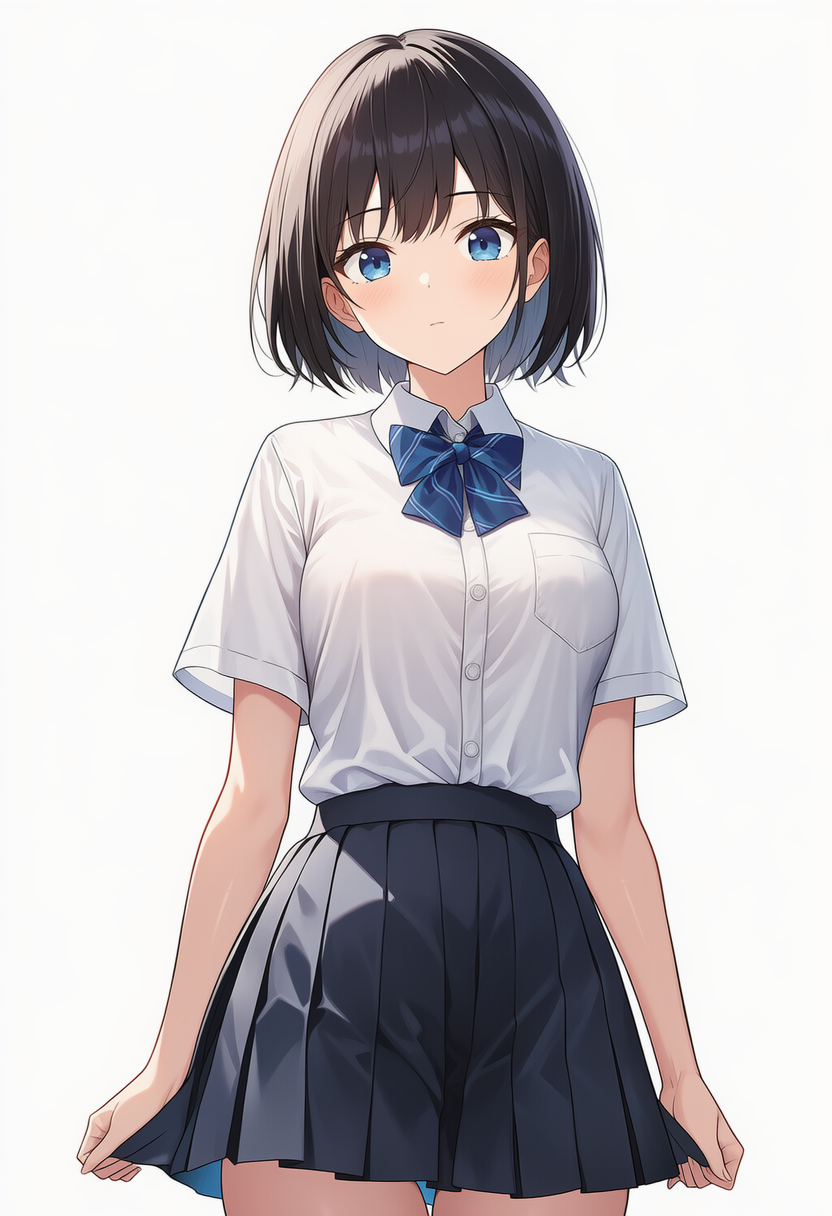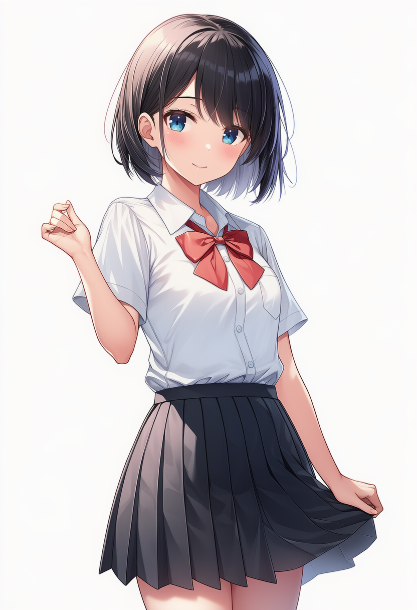 ・1girl, student, short hair, black hair, white shirt, black pleated skirt, white background, cowboy shot