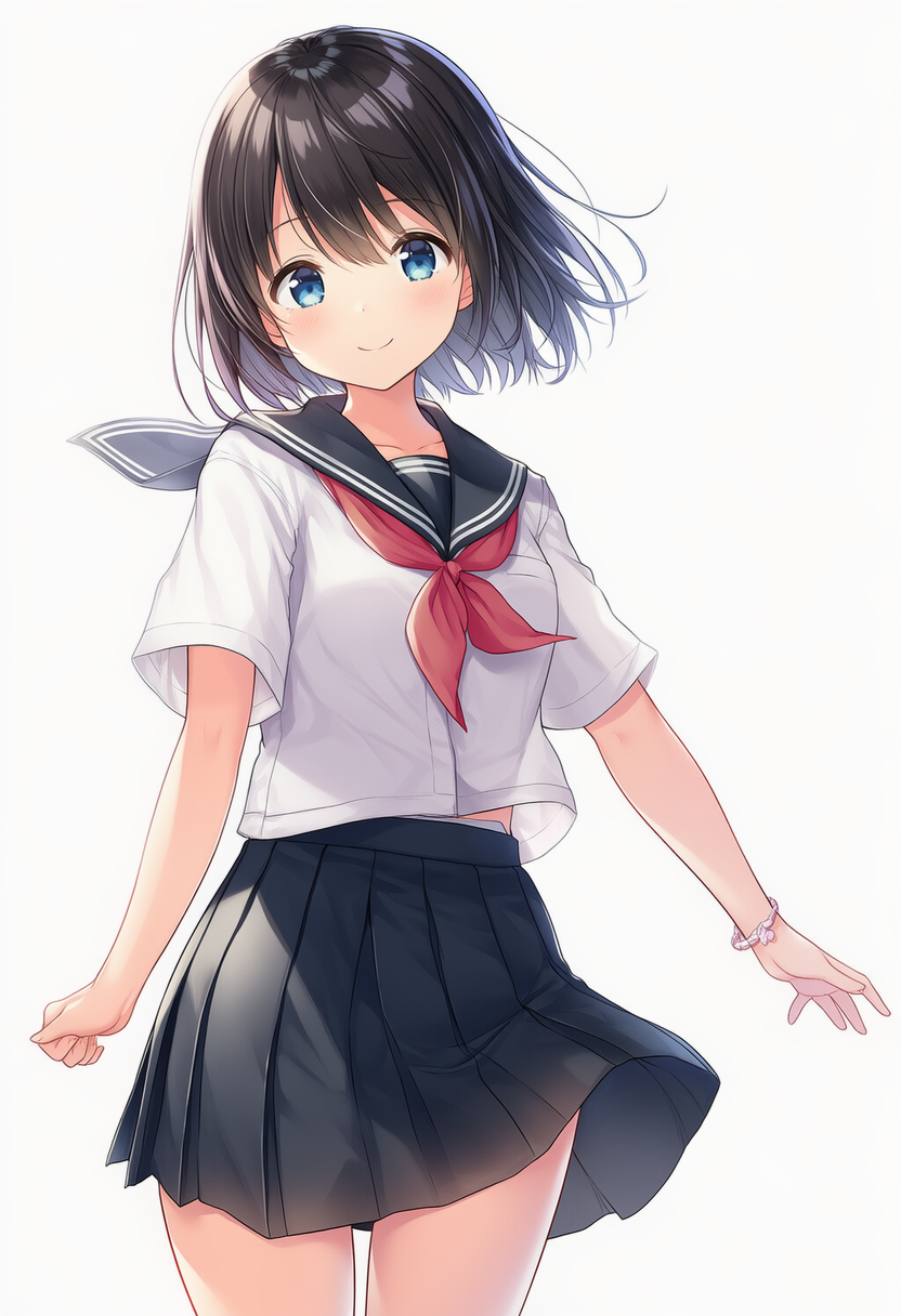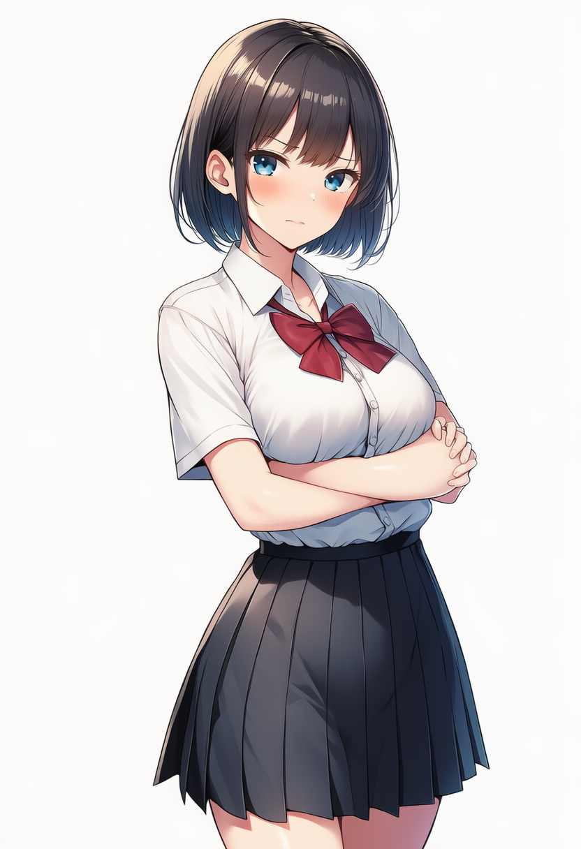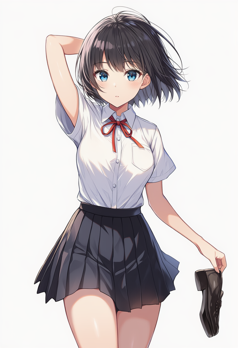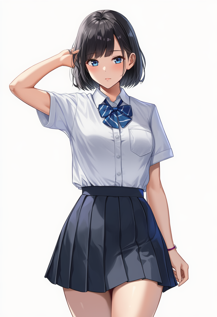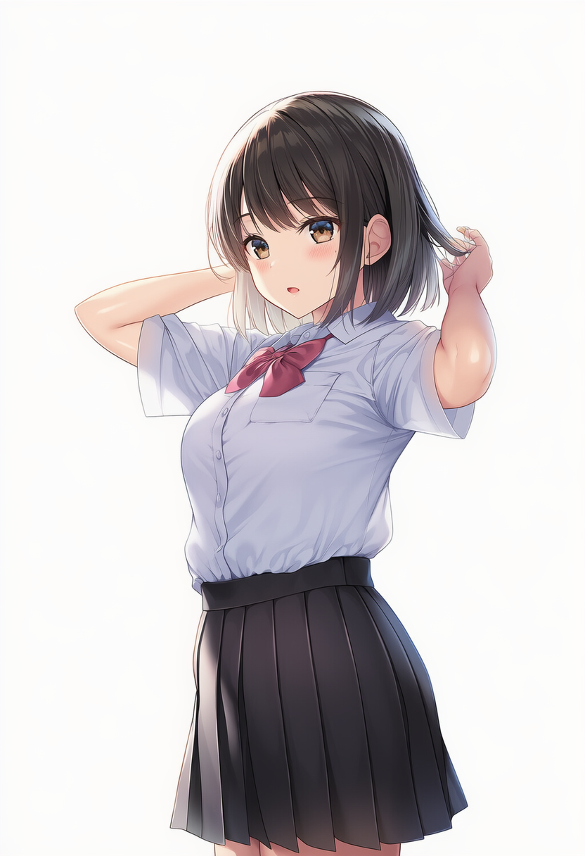 ・1girl, student, short hair, black hair, white shirt, black pleated skirt, white background, cowboy shot
