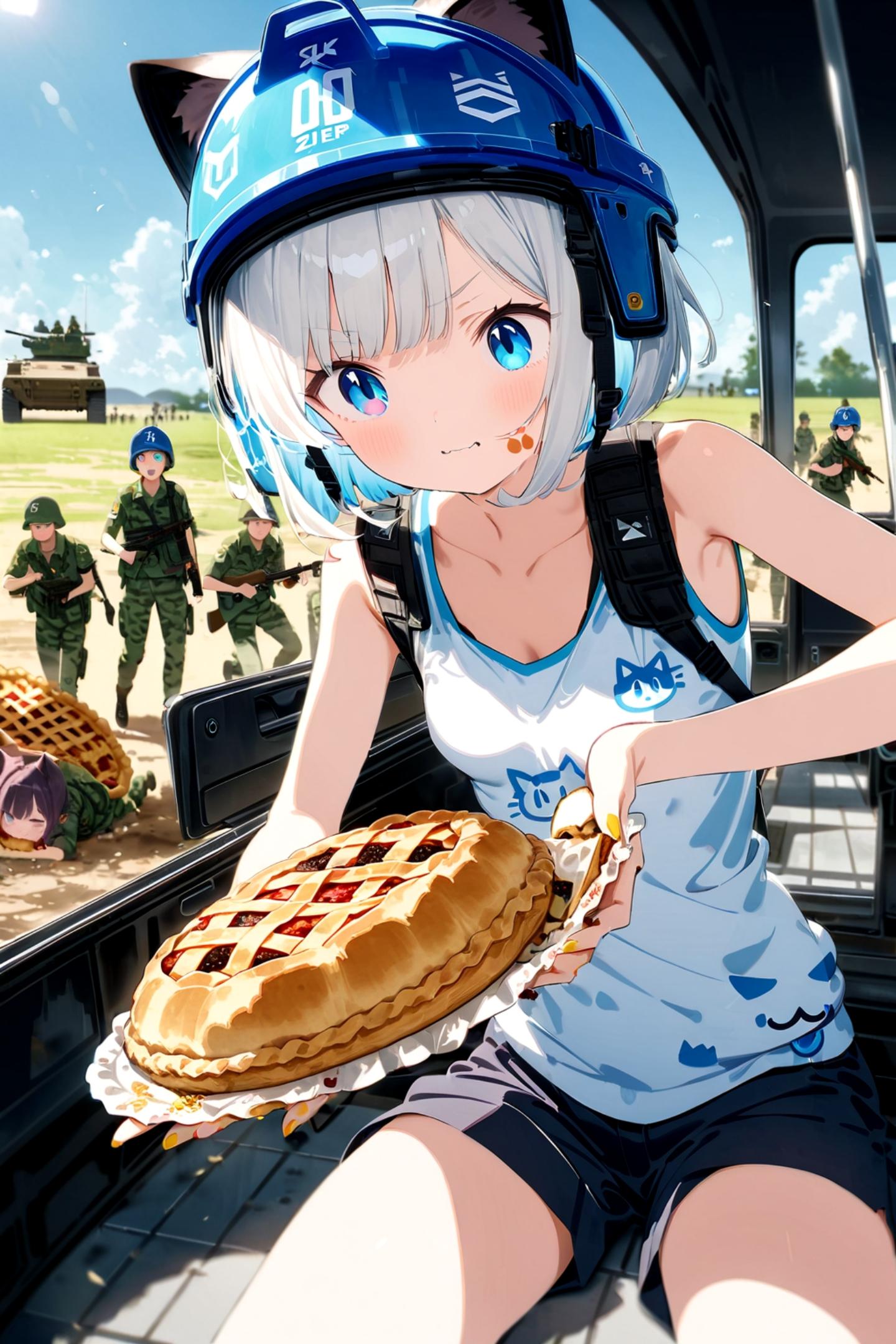 a girl,cat ears,short hair,white hair,blue eyes,20yo,small breast,army,blue helmet,