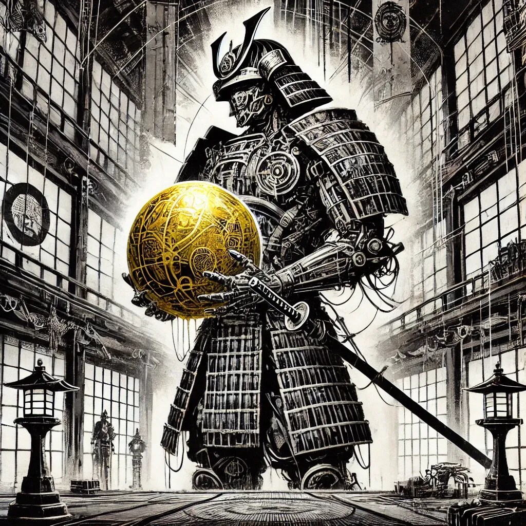 墨の濃淡で構成された世界の中に、金の球が持つ象徴性と存在感が際立っています。