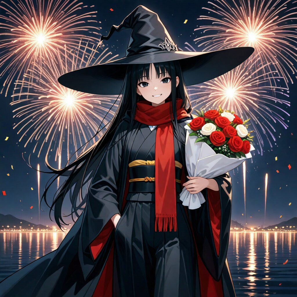 夜の花火を背に花束を贈る魔女