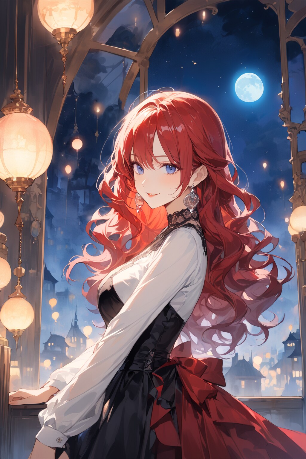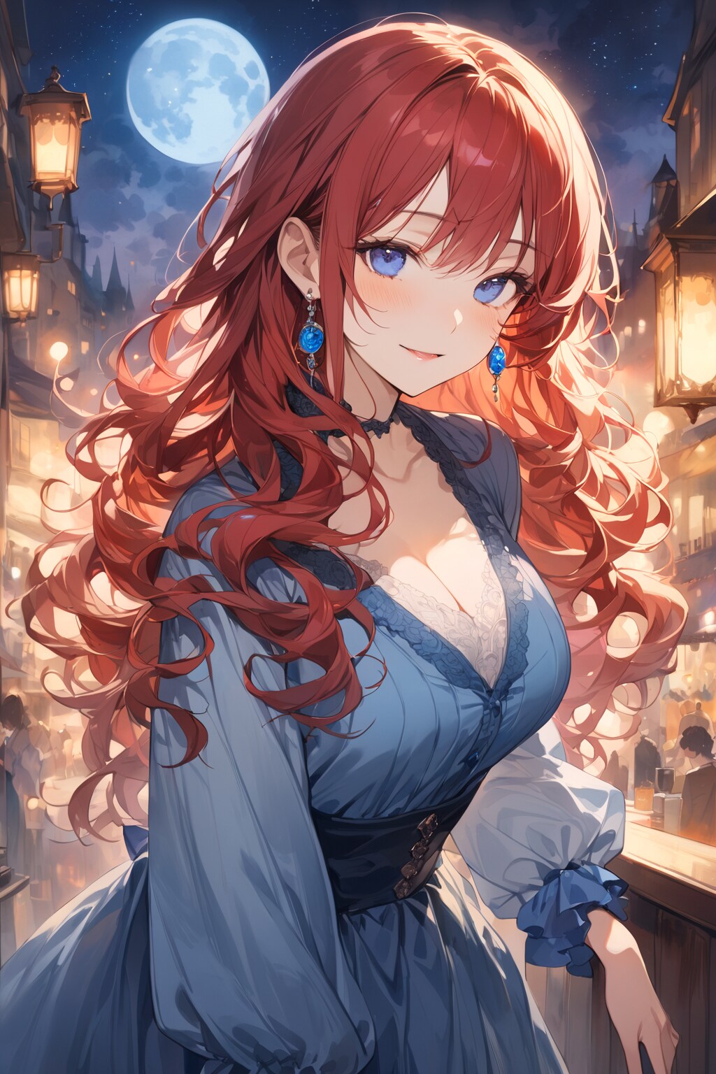 生成の過程の他のバージョンです。波打つ豪奢な赤い髪...をした彼女は作品ごとに前髪のあたりが微妙に違うのですが(笑)、額を出した完全センター分けでなくてちょい前髪があるぐらい..にするのに調整やガチャがいりますね。これぐらい髪が長いと自動的にセンター分けになる挙動がどのモデルでも多いですね。