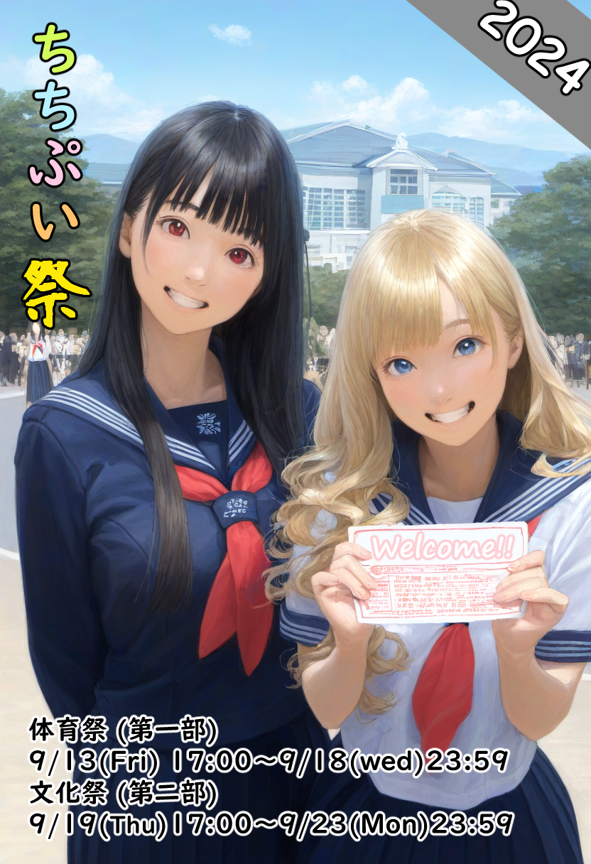 1枚目はちちぷいちゃんとししょちゃんをモデルに学園祭のポスター風に仕上げてみました。