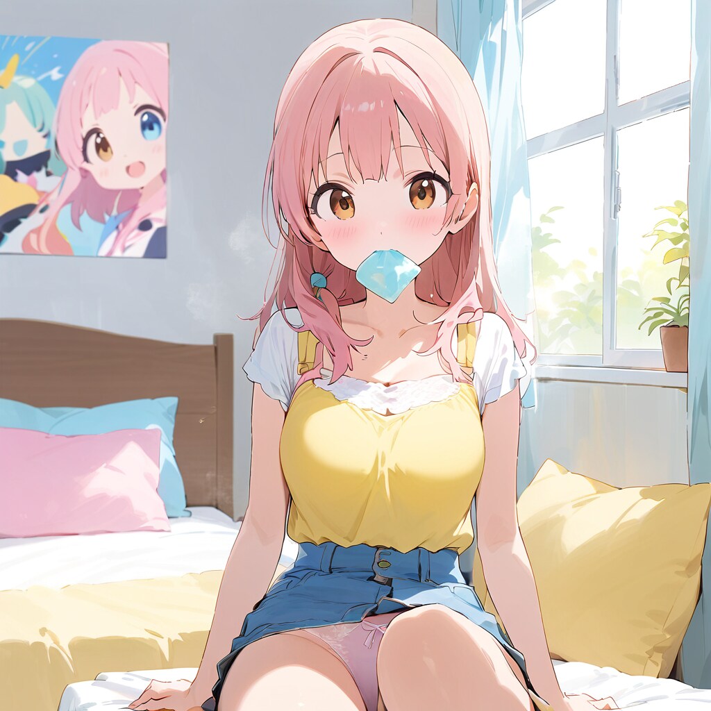 咥えゴムでパンティをちら見せして誘ってくる子。テンプレのパステルカラーを魔改造してごめんなさい。
