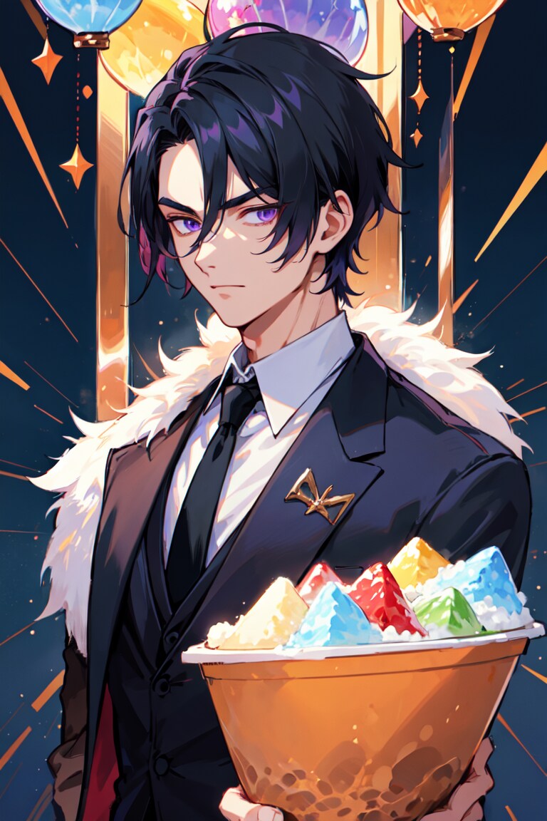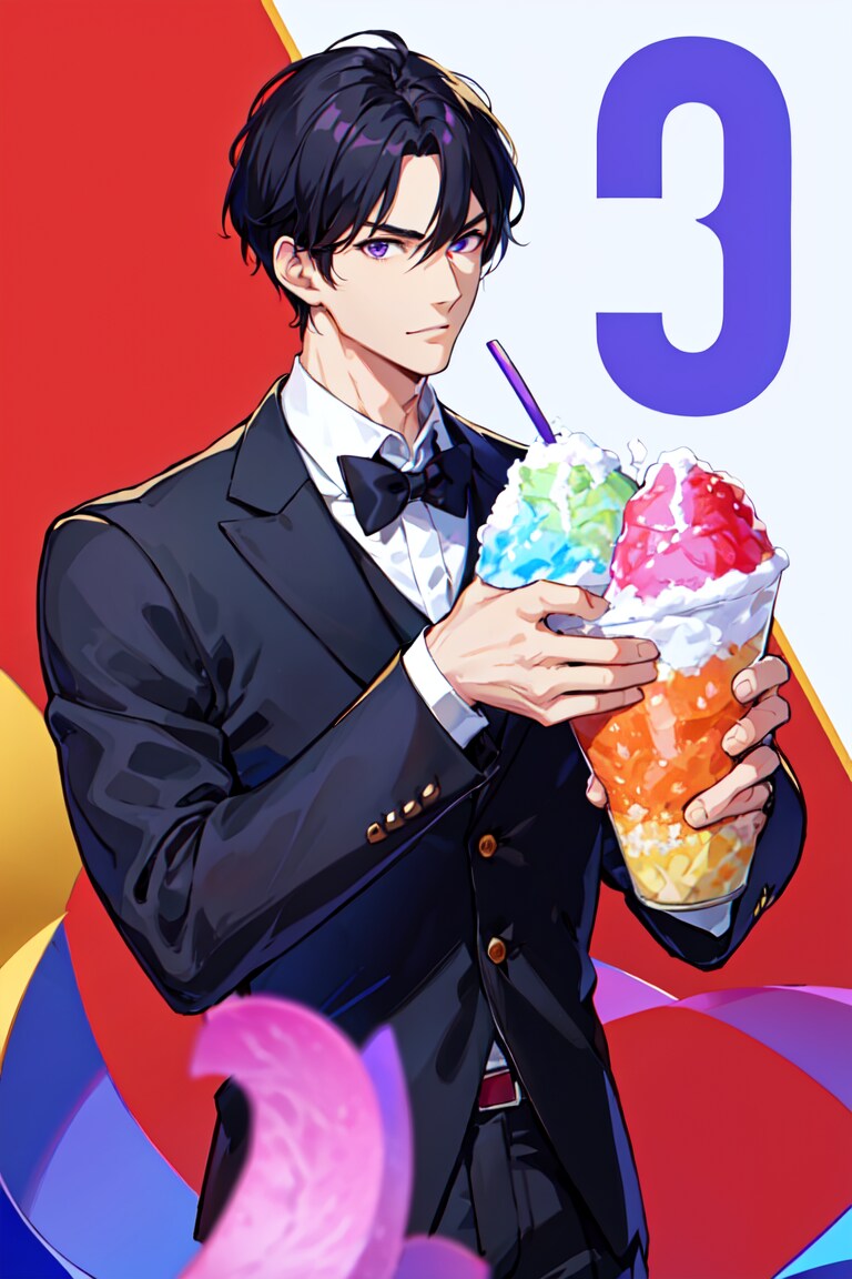 黒髪短髪男性でも、生成していました(苦笑)。なかなかかき氷付きで出てこなかったのですが、出てきた時は、このようにイケメンなのにインパクト大で出てきて面白かったですー。