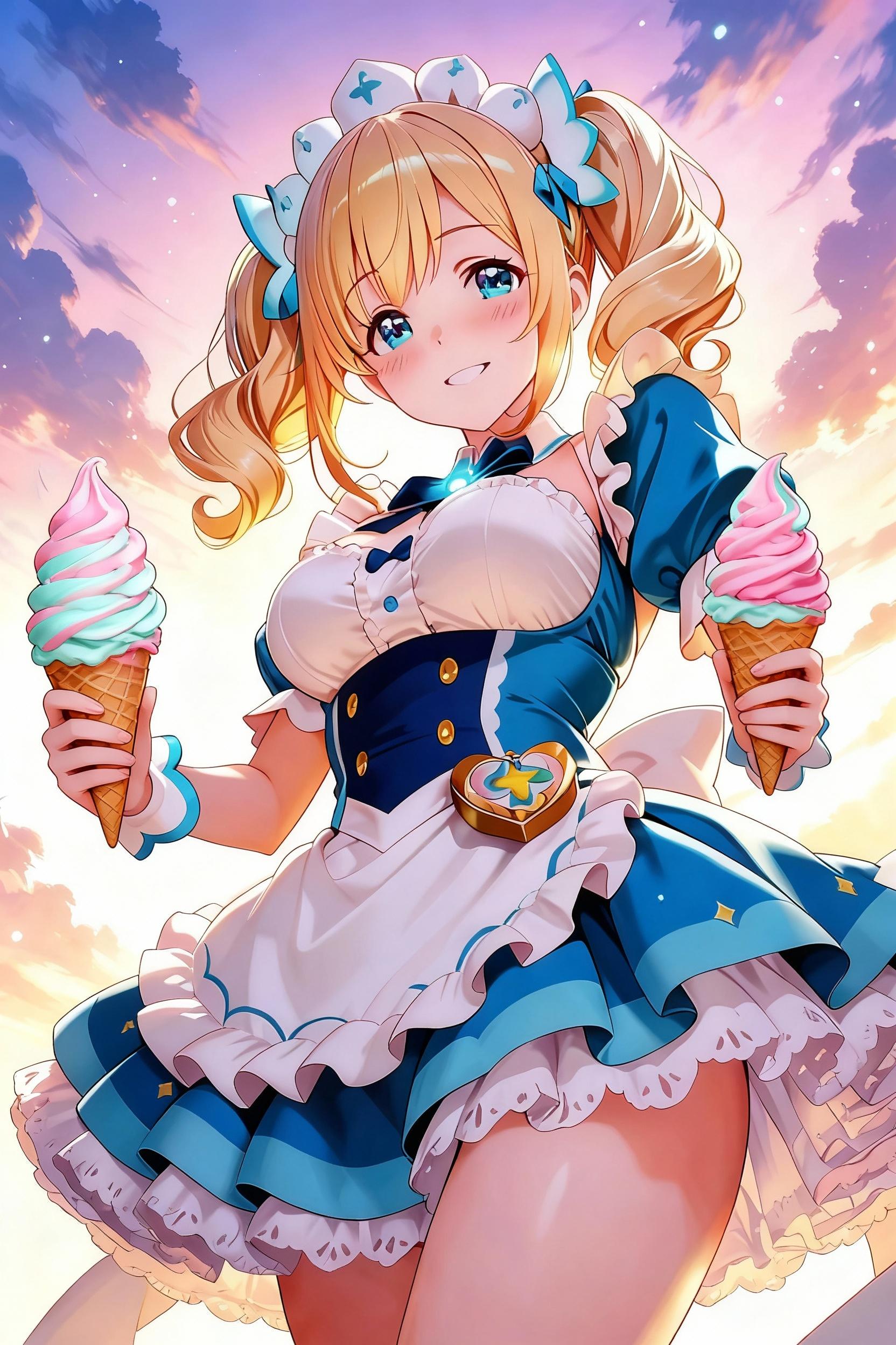「Please hold a soft serve ice cream cone in each hand. The ice cream is pastel colored with pink and mint swirls.」
