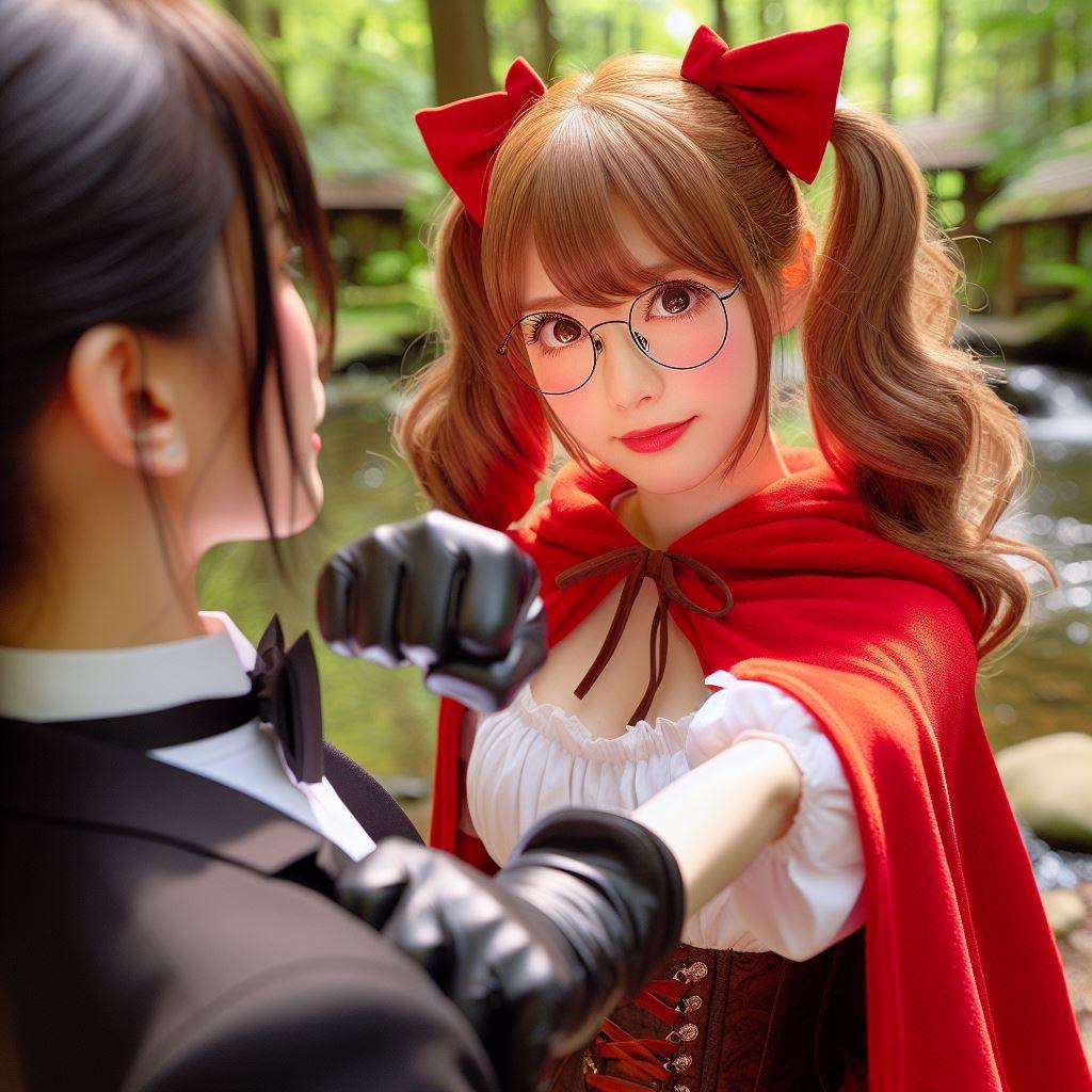 赤ずきんちゃんに往年の横山やすしの「メガネ、メガネ…」をやって欲しかったのですが、「額の上に眼鏡を置いて探す」プロンプトがうまく機能しなくて、どうしても眼鏡をかけてしまうので、眼鏡を外してしまいました。