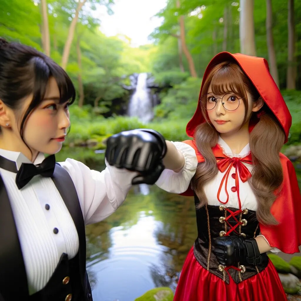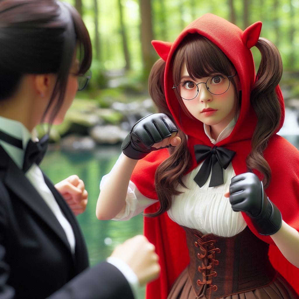 泉のほとりで決闘する執事ちゃんと赤ずきんちゃん(1-2枚目)