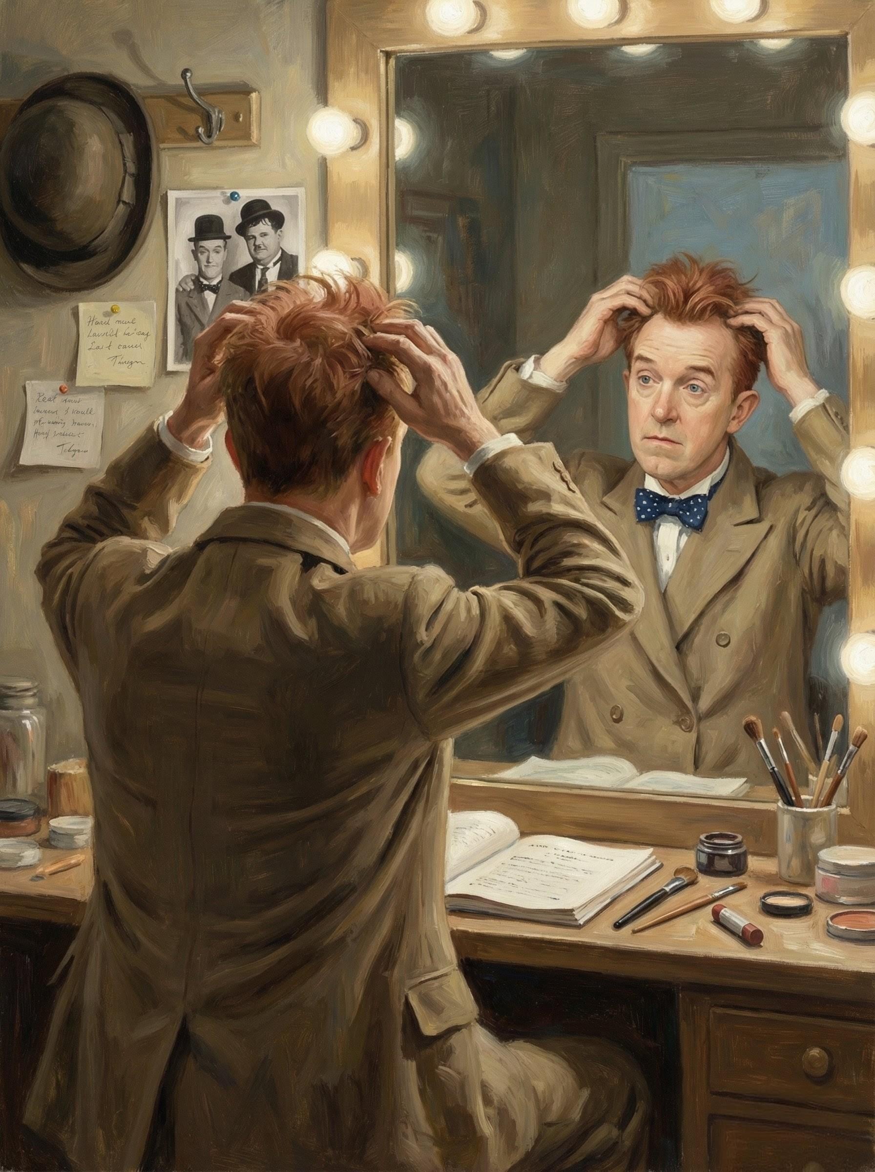 2枚目は、トレードマークの寝癖ヘアをセットするスタン・ローレルです。