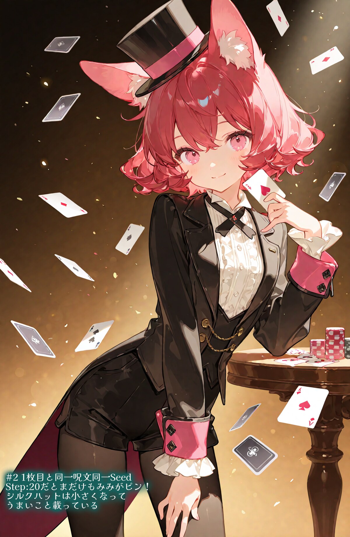 ●#3枚目:1枚目と同一Seed同一呪文なんですがStep数20のもの。ears down は効いてませんがハットが小さくなってうまく帽子が載っています。