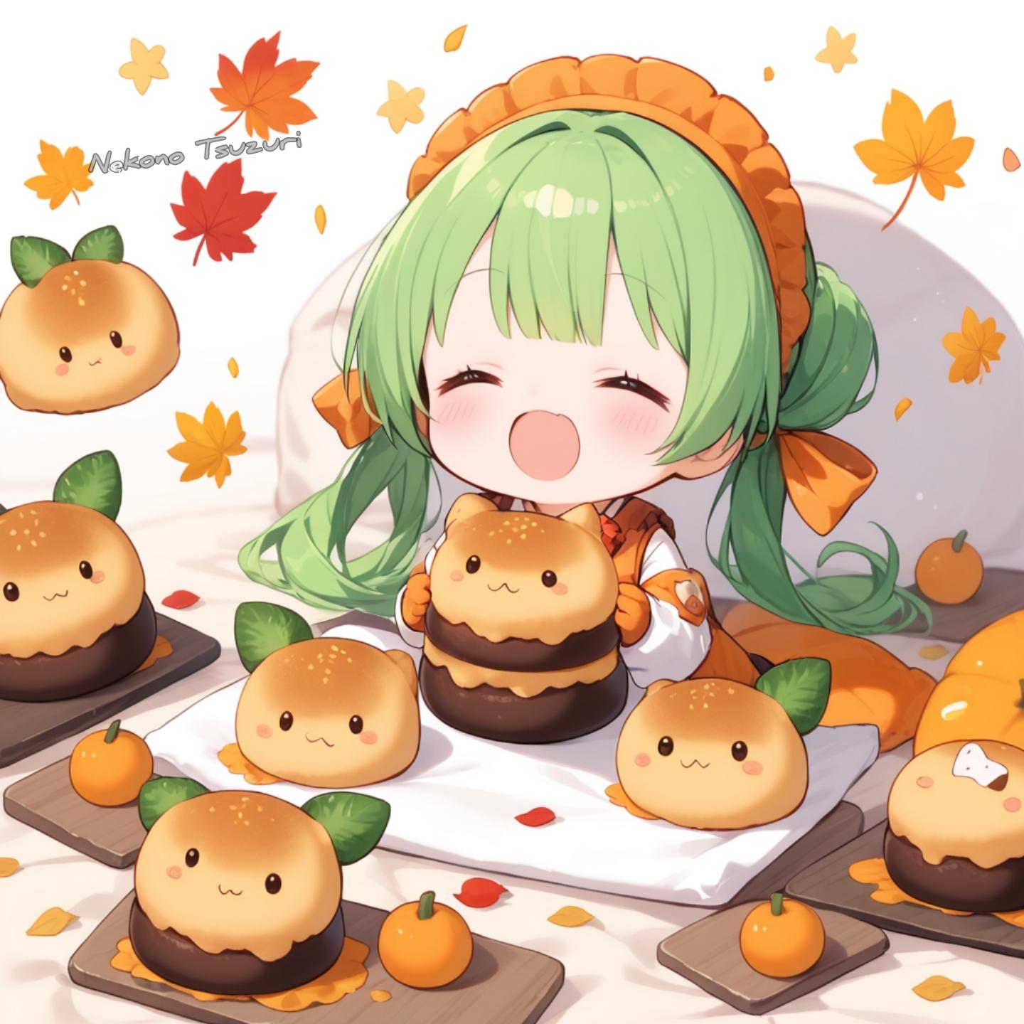 グラタンコロッケを食べるちびキャラ。