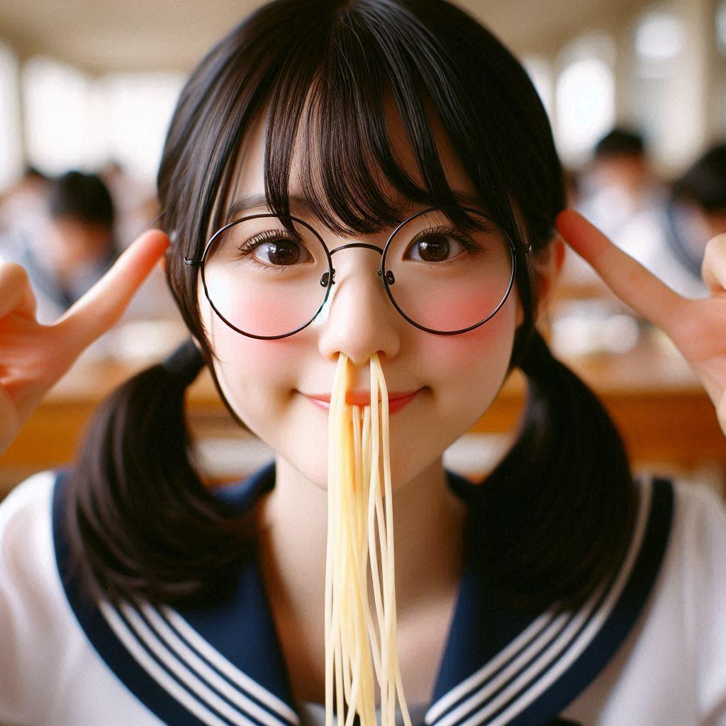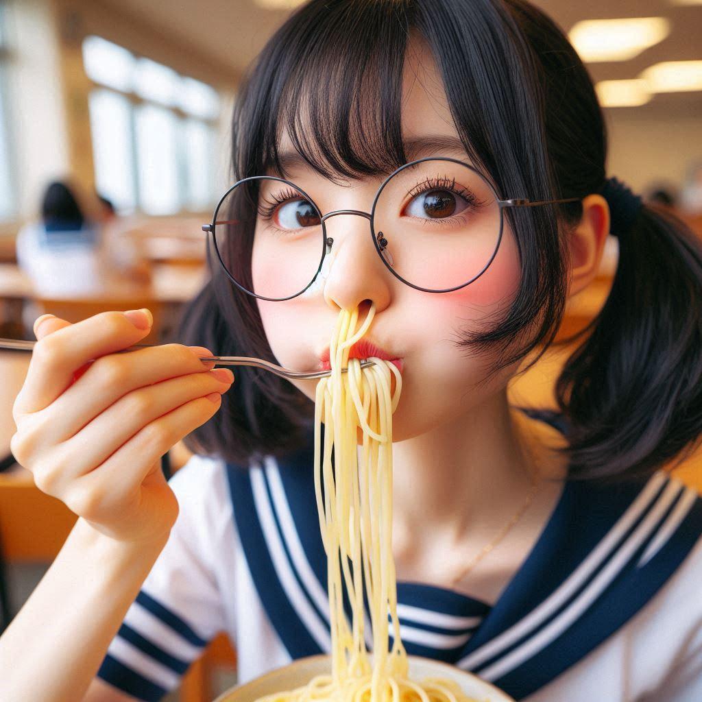鼻でスパゲッティを食べる少女