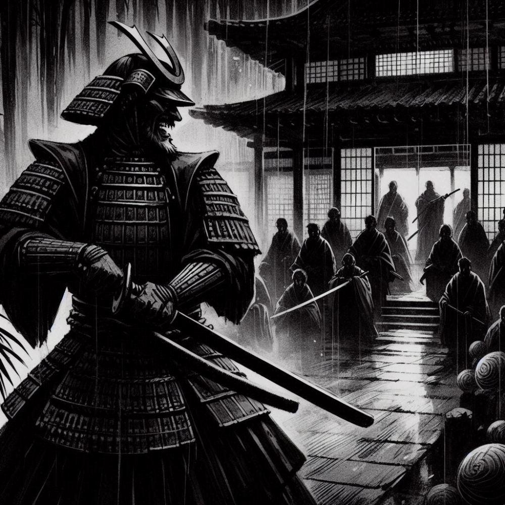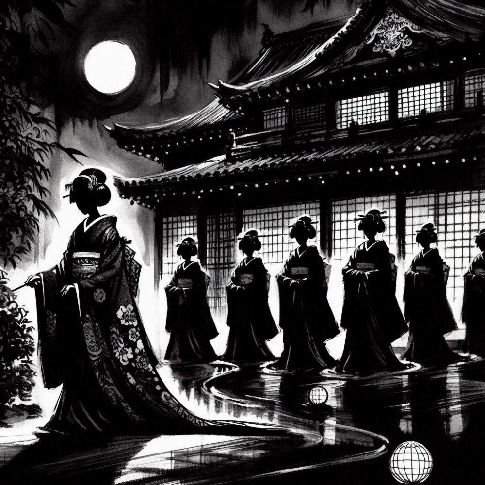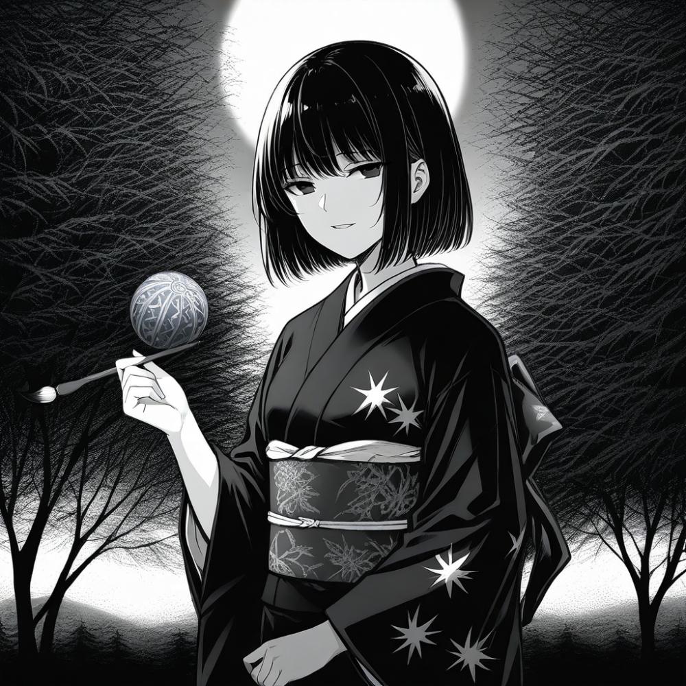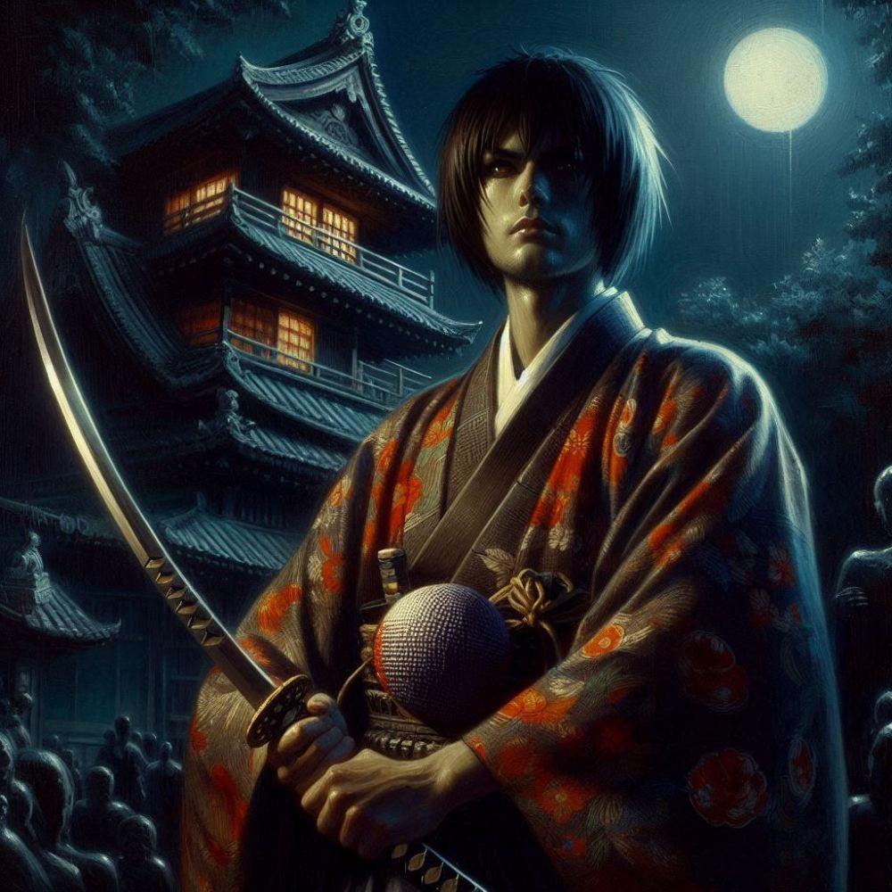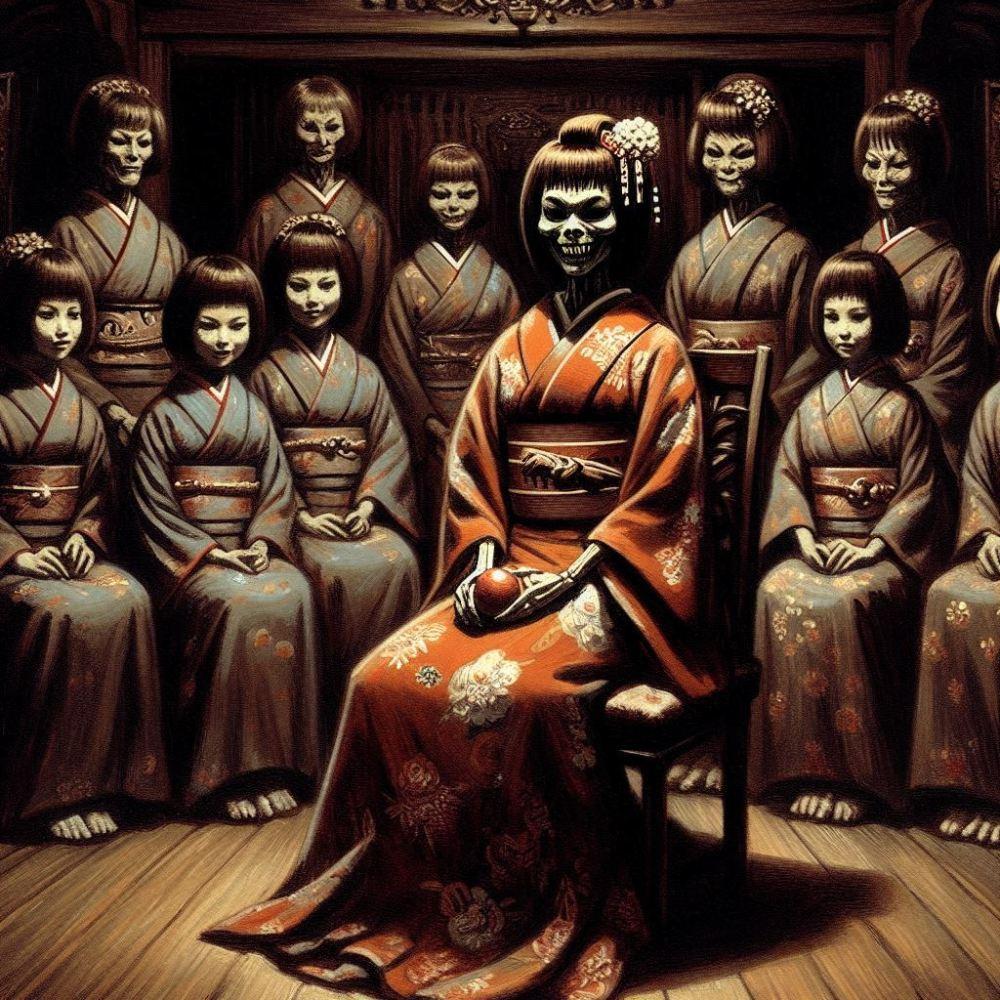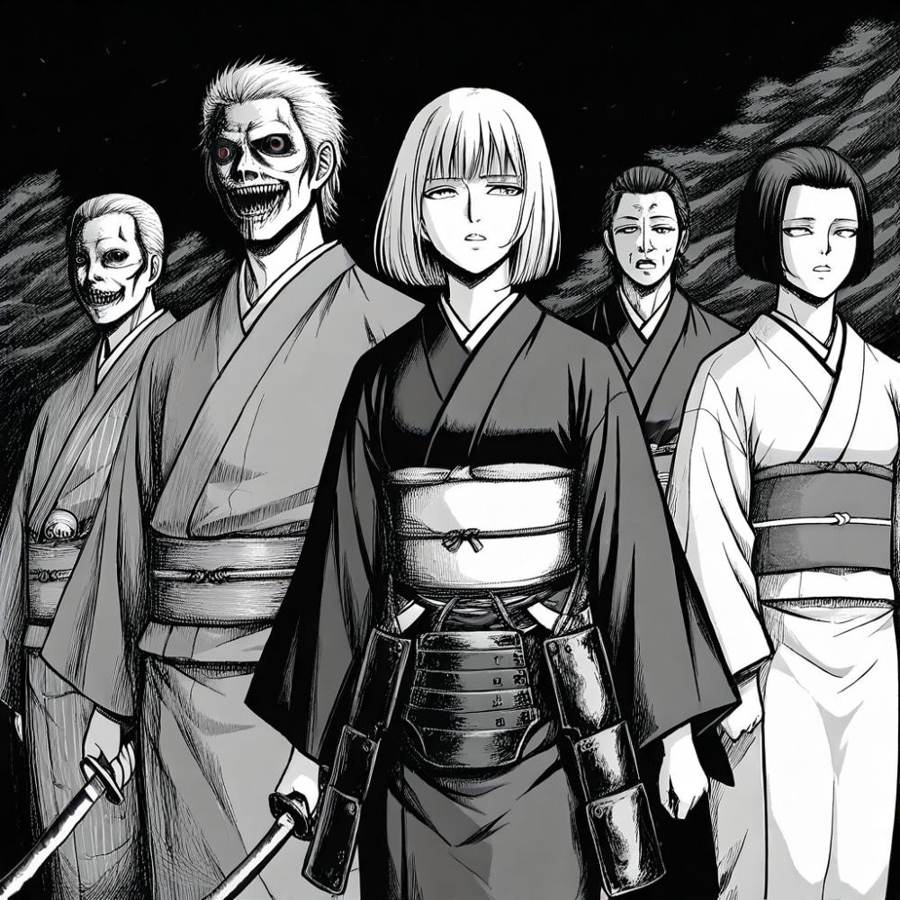 1950年代怪談風墨絵油絵風、アメリカ西海岸おかっぱサムライ妖怪座敷童子