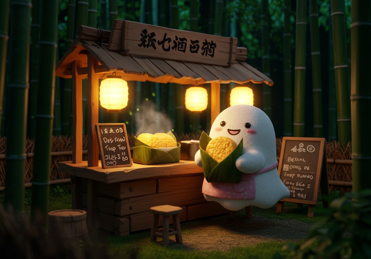 謎の海産物さんの、こちらの可愛らしい御狐さんから、竹林で総菜屋台を商い中の、お化け店主を連想致しました。