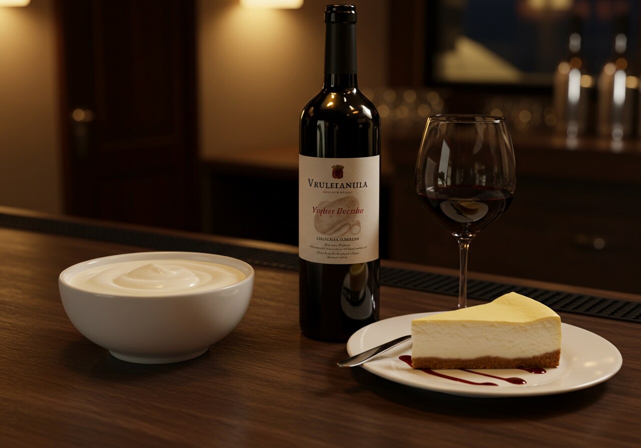 デザートのチーズケーキとヨーグルトとワインのセット