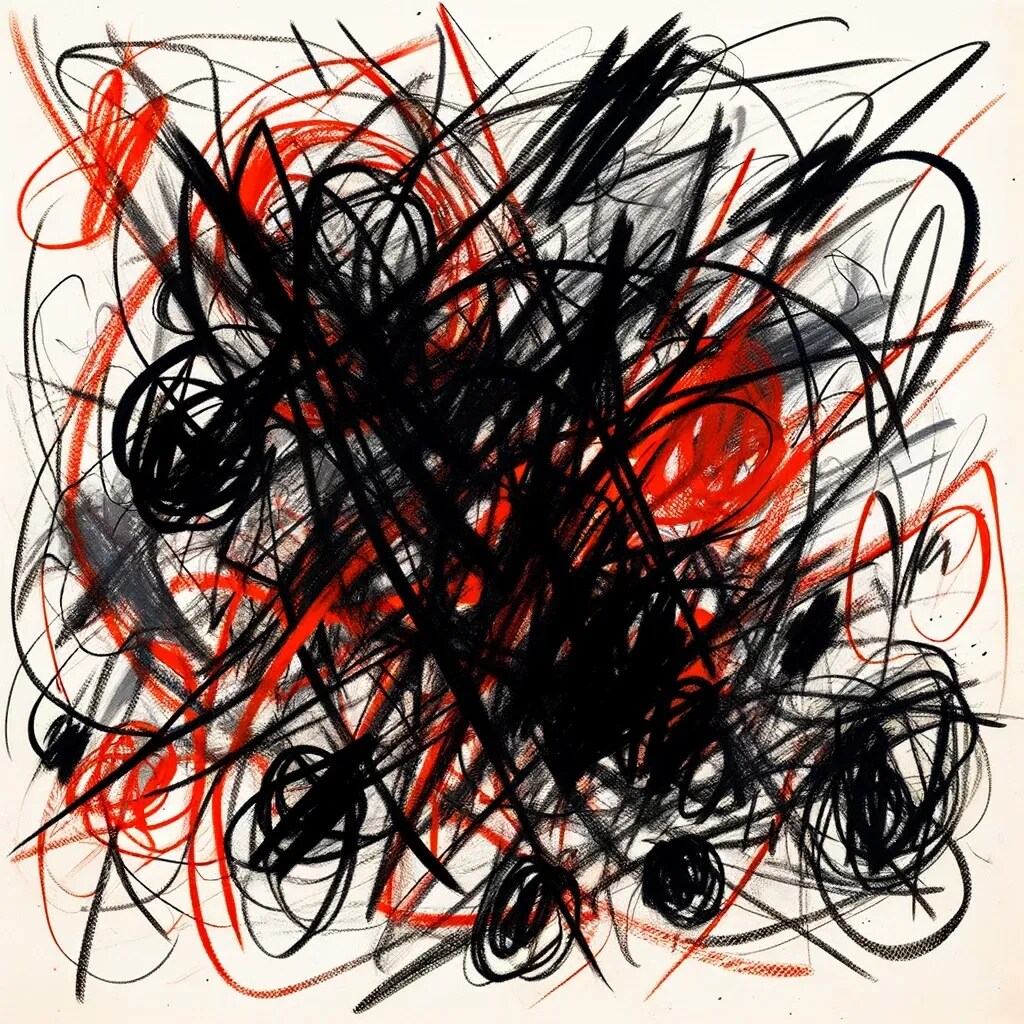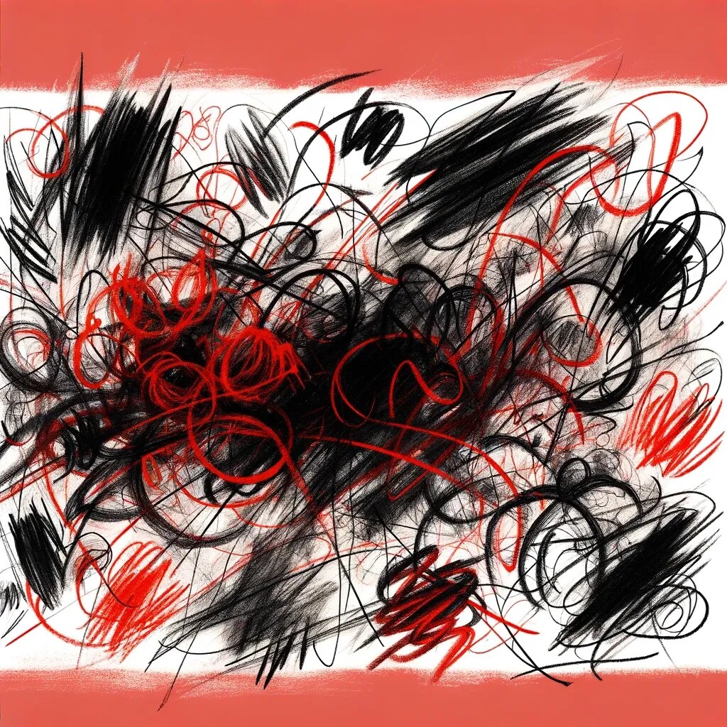 2歳児が赤と黒の色鉛筆で描いたような、「強い敵意」をテーマにした抽象画をDALLEくんに描いてもらいました。