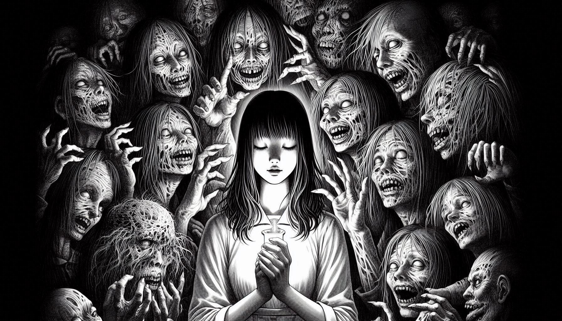 内容は、黒髪の聖女が”神への祈り”を捧げた際、祈りの光に救いを見出した亡者達が我先にと集まってきた!的なイラストです。
