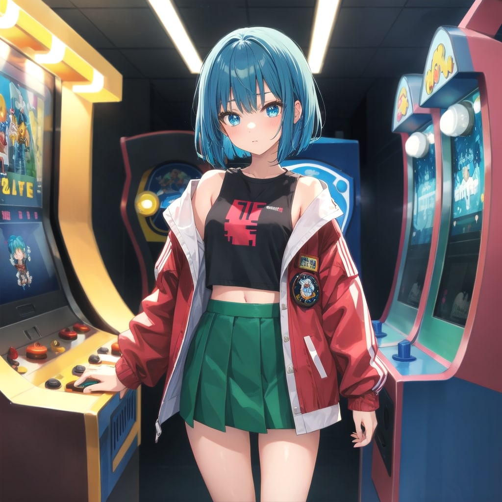 青髪ボブ子ちゃんは、レトロゲームセンターを舞台に撮影。