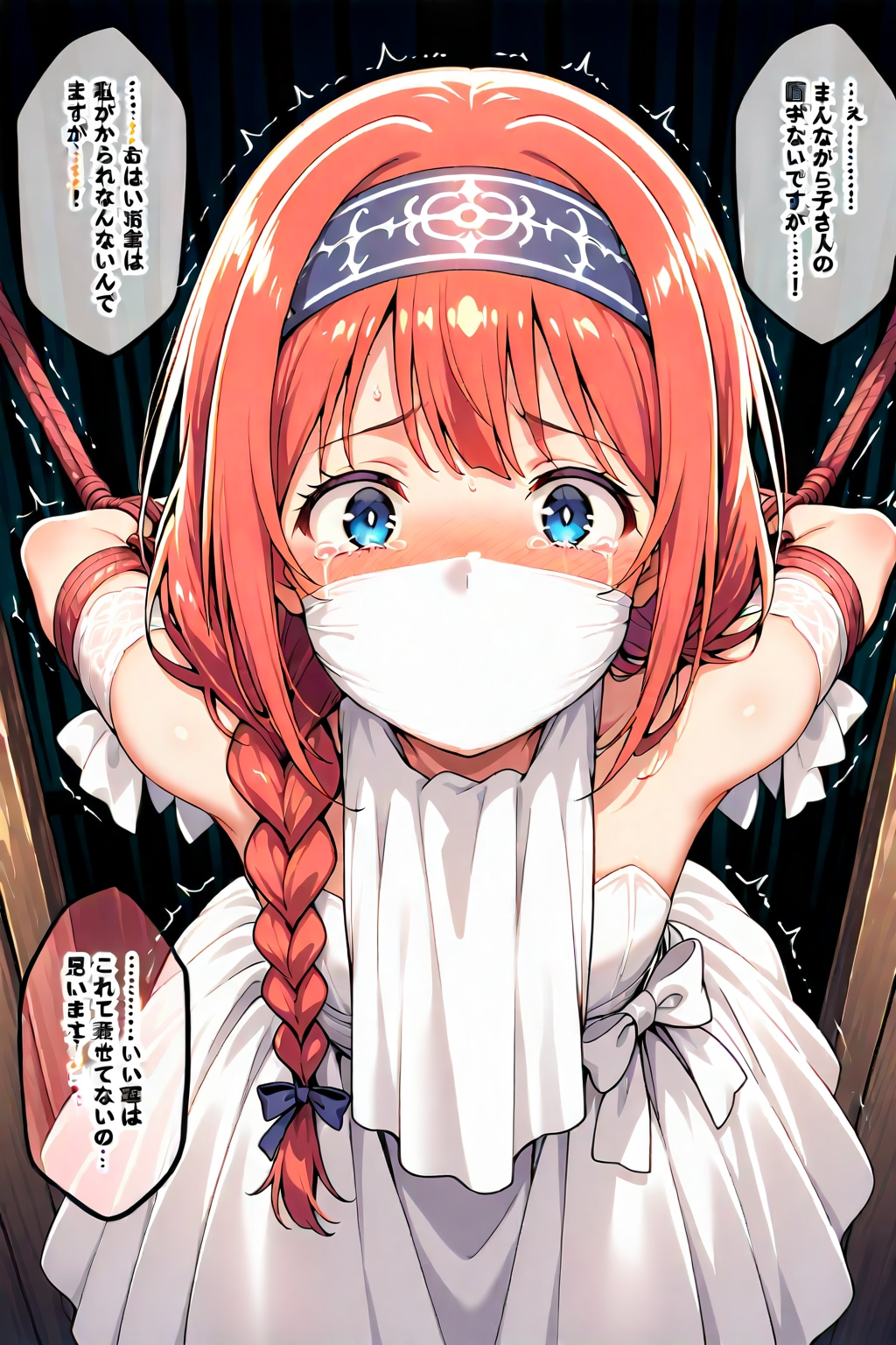 映研部員たちは小織の口に布をたっぷりと詰め込み、それが吐き出せないように鼻から口を覆うように猿轡をしてしまう。さrに小織の両手足をきつく縛った。