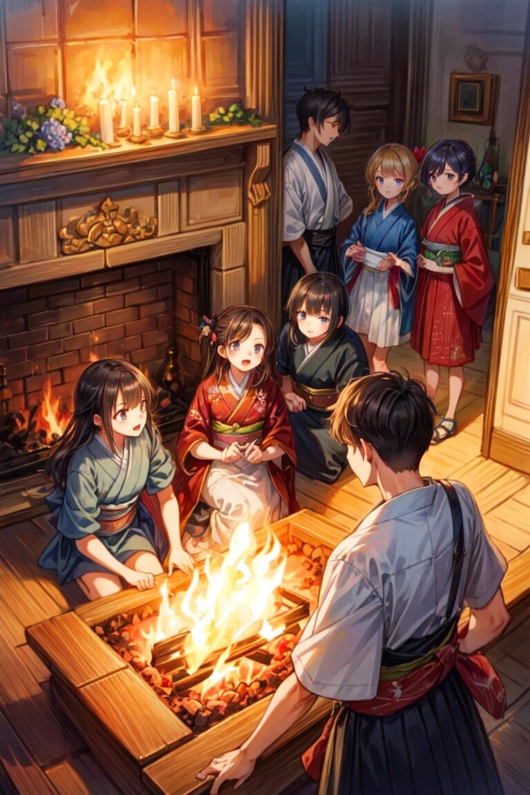 結果、レトロモダンっぽい?囲炉裏っぽいものが出てきて良かったです。みんな暖を取っている様子がちゃんと描けていてよかったです!!あと何故か暖炉も出てきています。