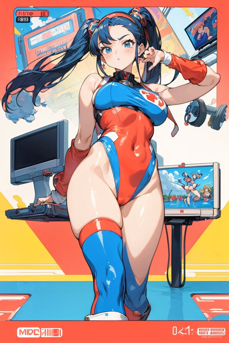 一応、私の脳内では一枚目が一番古いイベントポスターで二枚、三枚と進むにつれて時代が新しくなっている的な設定です。(一枚目より二枚目の方がハイレグなのは次代の流れということで・・・あと後に行く程モニターが現代の液晶?っぽくなります)