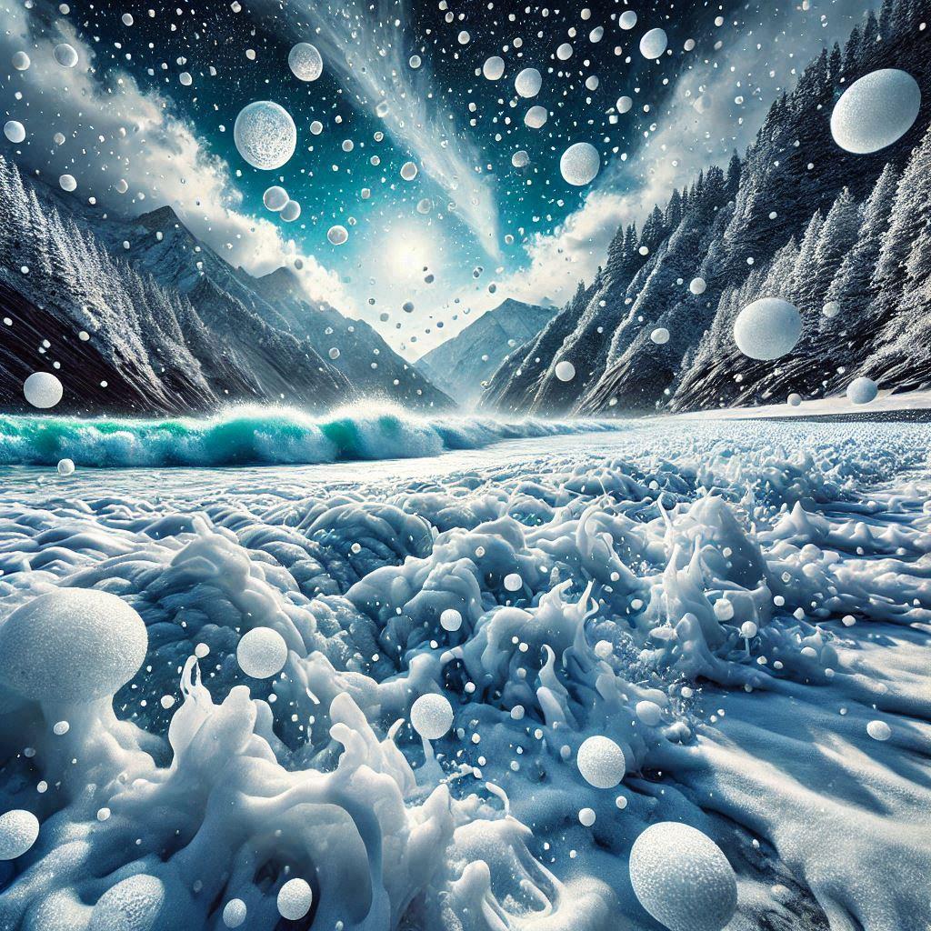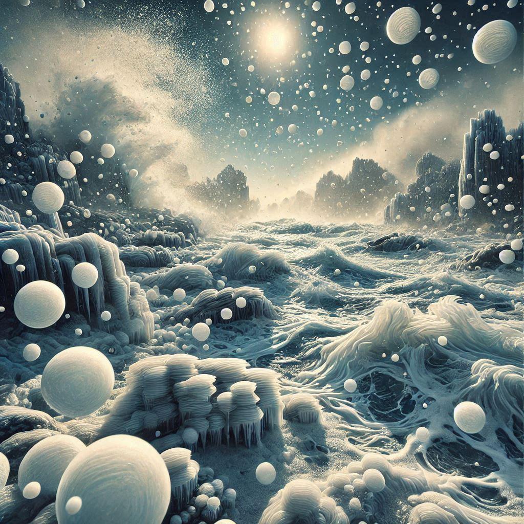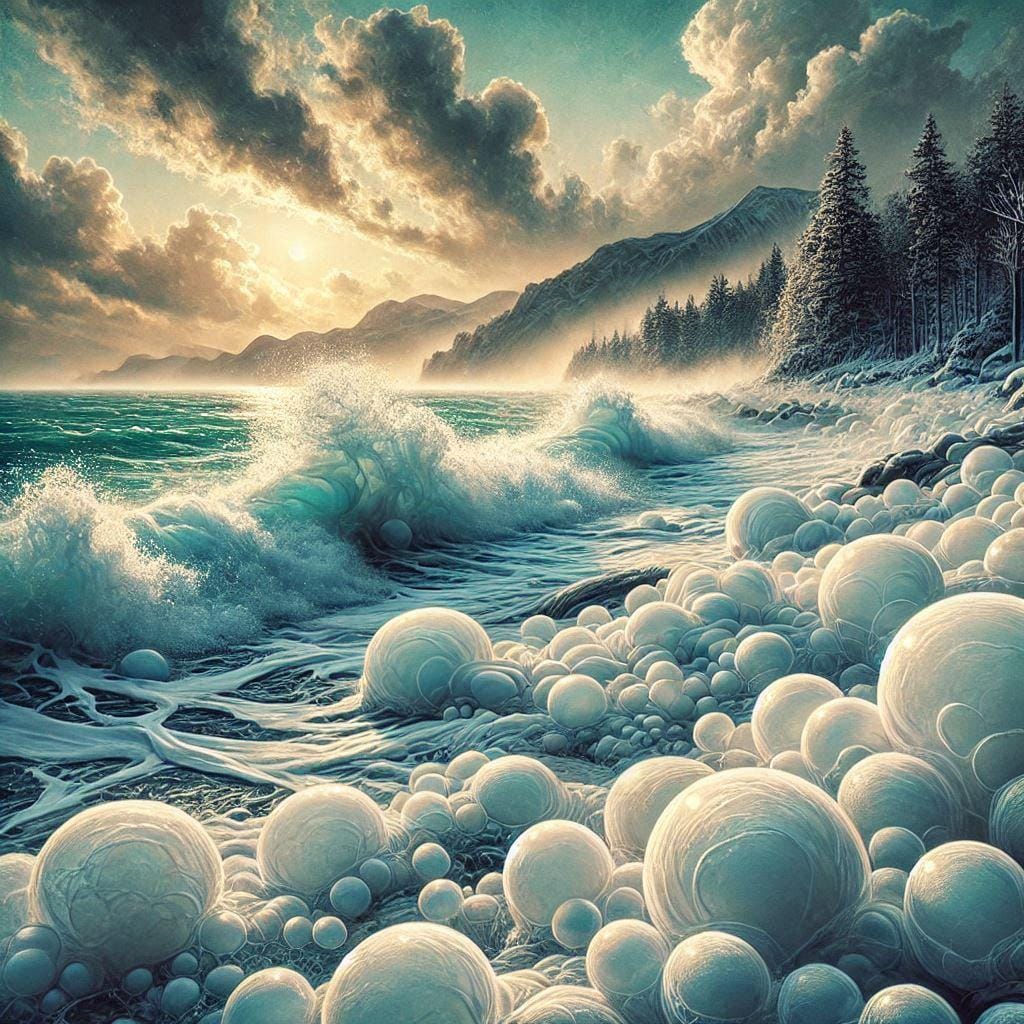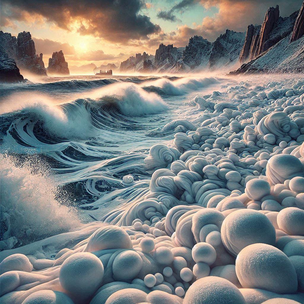 それが海岸に吹き寄せられて、白い氷の泡が海岸を埋め尽くします。